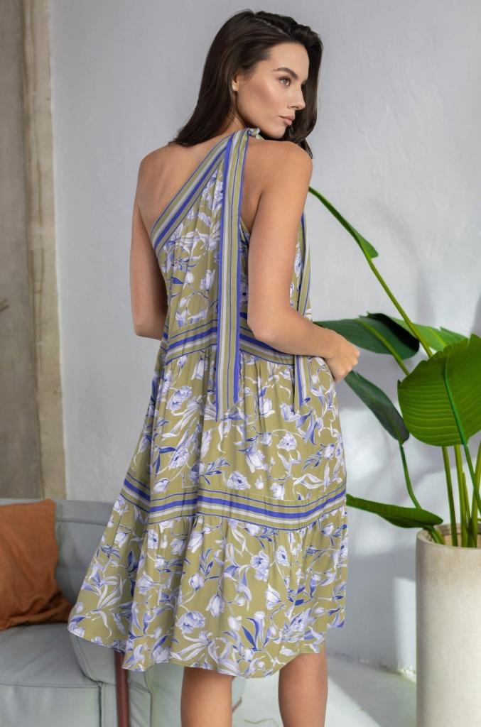 Сарафан Mia-Amore длиной до колен, свободного силуэта с несколькими ярусами оборок и с бретелью на одно плечо. Изделие выполнено из тканой принтованной вискозы с добавлением шелка.