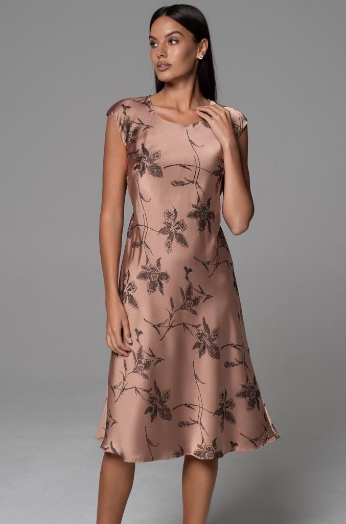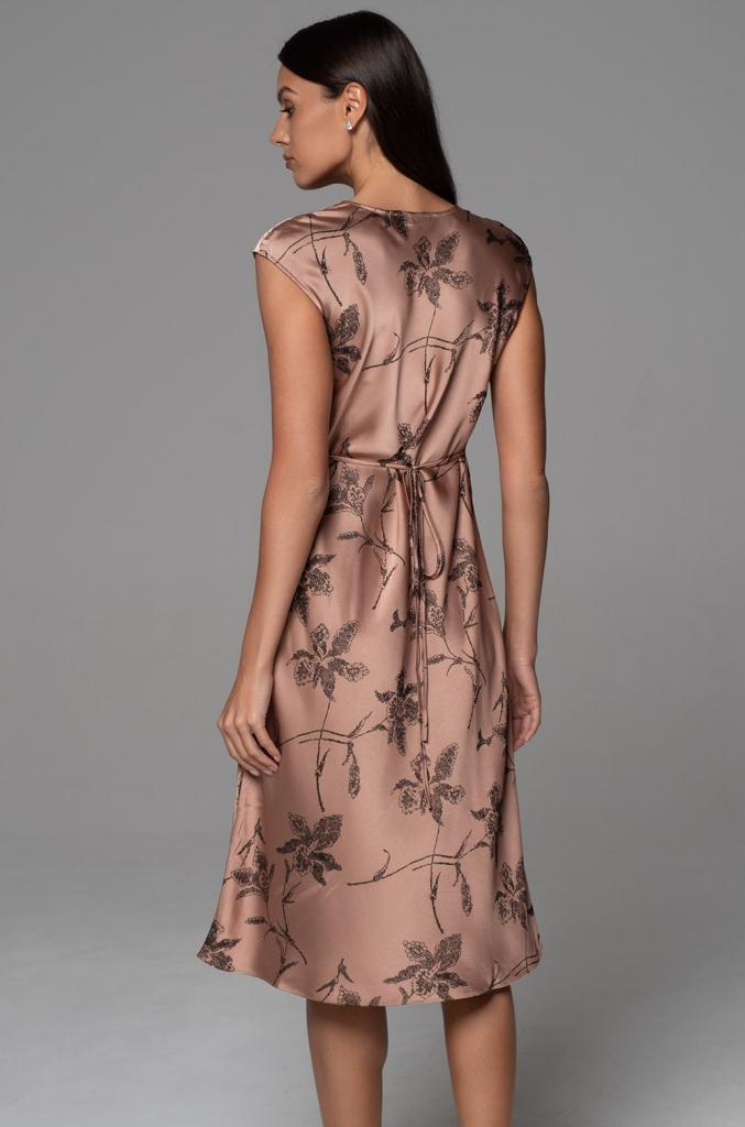 Платье средней длины Mia-Amore выполнено из жаккардового двухцветного смесового шёлка. По горловине О-образный вырез. По талии платье слегка приталено, что подчёркивает силуэт. Плечи слегка спущены.