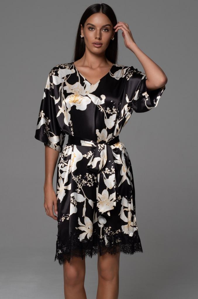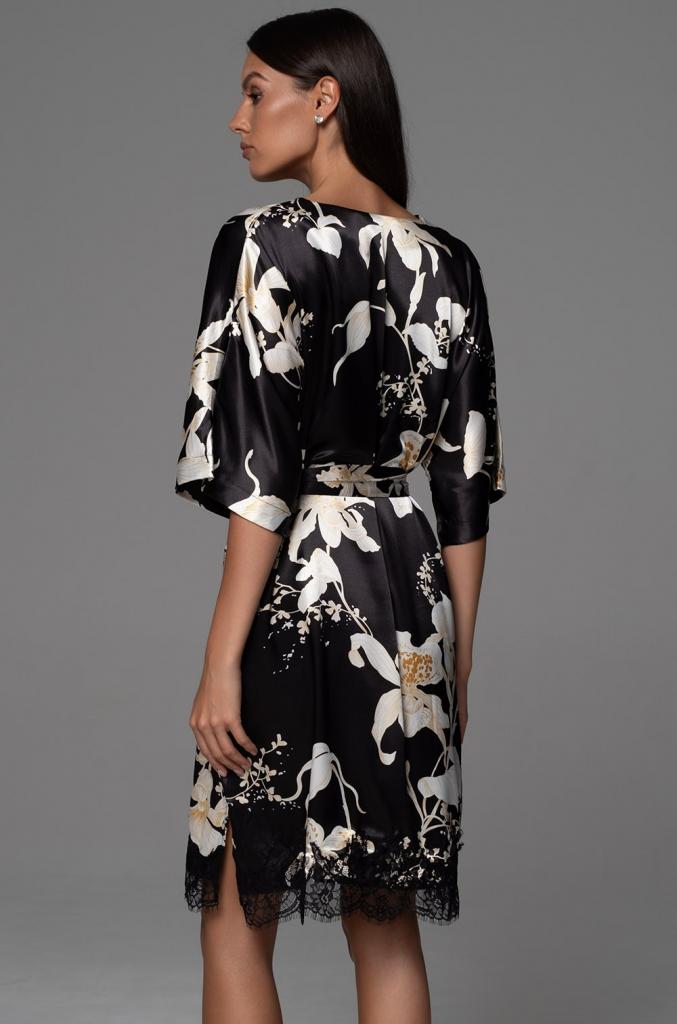 Туника Mia-Amore длиной ниже колен и спущенными плечами, V-образным вырезом горловины выполнена из принтованного смесового шёлка. Туника по низу декорирована широким изящным кружевом. По бокам туники есть карманы и разрезы.