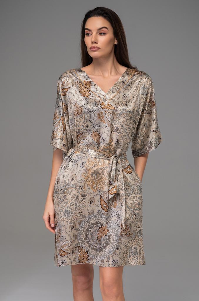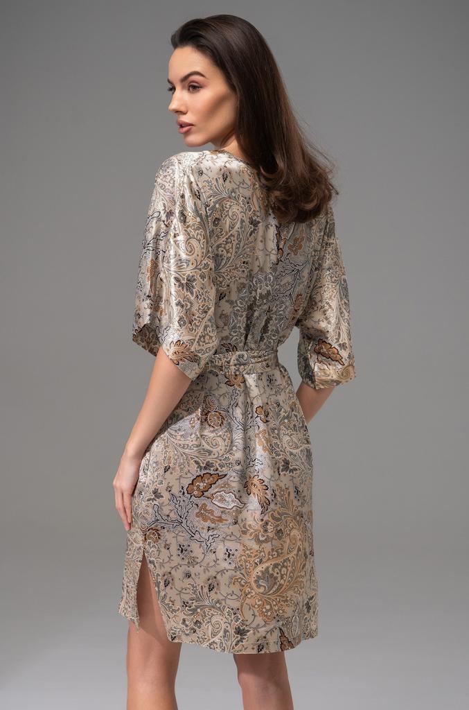 Туника Mia-Amore свободного кроя длиной до колен с цельнокроеными укороченными рукавами выполнена из принтованного смесового шелка. V-образный вырез горловины и низ рукавом обработаны обтачками. Туника комплектуется поясом, по бокам расположены карманы.