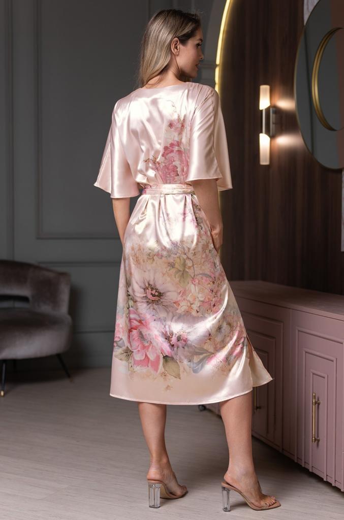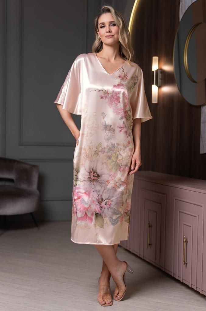 Длинная туника Mia-Amore выполнена из смесового принтованного шёлка. Удобные спущенные расклешённые к низу рукава и свободный силуэт делают эту модель комфортной. По талии ширина туники регулируется съёмным поясом. В боковых швах карманы.