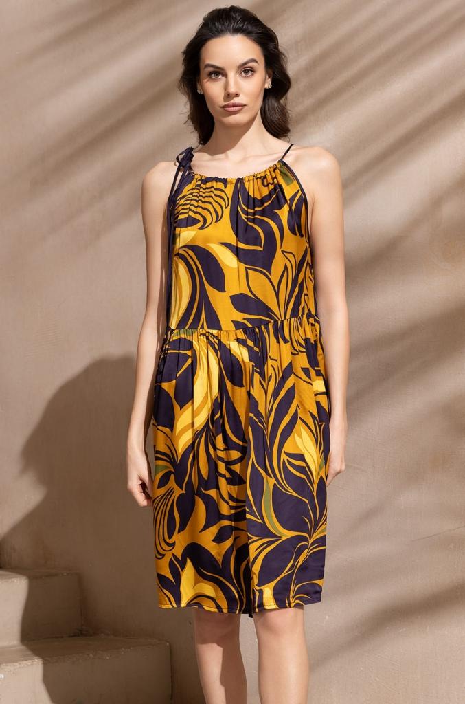 Короткий сарафан Mia-Amore свободного силуэта с оборкой по низу, на тонких бретелях. Изделие выполнено из принтованного смесового шелка.