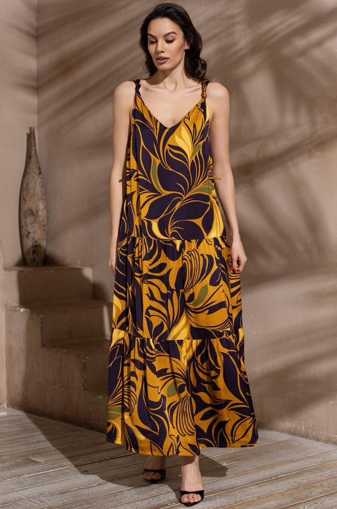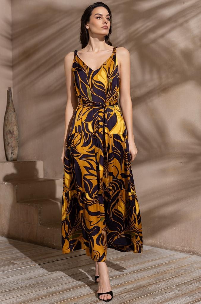 Длинный сарафан Mia-Amore свободного силуэта с оборками по низу, на бретелях. Изделие выполнено из принтованного смесового шелка. Линию талии можно подчеркнуть за счет пояса, который идет в комплекте.