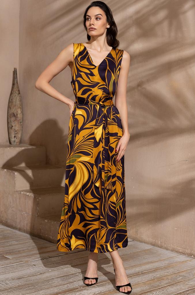 Длинный сарафан Mia-Amore свободного силуэта на широких бретелях и разрезами по бокам, длину которых можно регулировать за счет пуговиц. Изделие выполнено из принтованного смесового шелка. Линию талии можно подчеркнуть за счет пояса, который идет в комплекте.