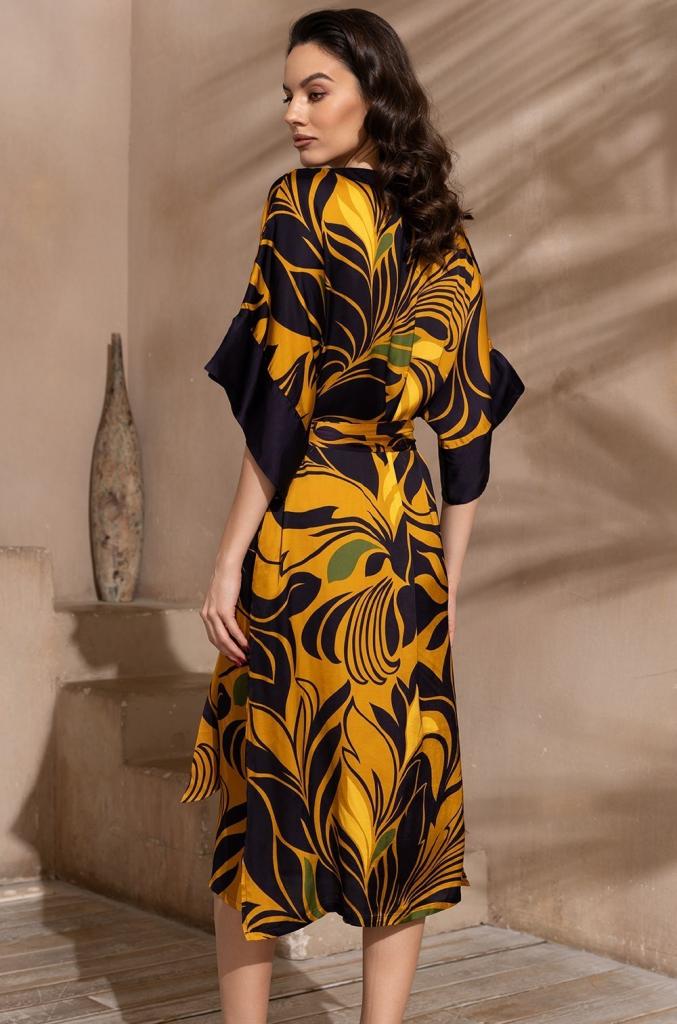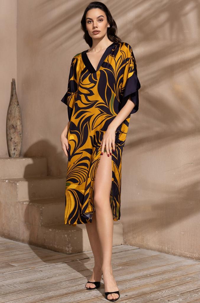 Длинная туника Mia-Amore с широким рукавом длиной до локтя. Изделие выполнено из принтованного смесового шелка с однотонной отделкой по вырезу и низу рукавов. В боковых швах обработаны карманы. По бокам расположены разрезы для свободы движения. Линию талии можно подчеркнуть за счет пояса, который идет в комплекте.