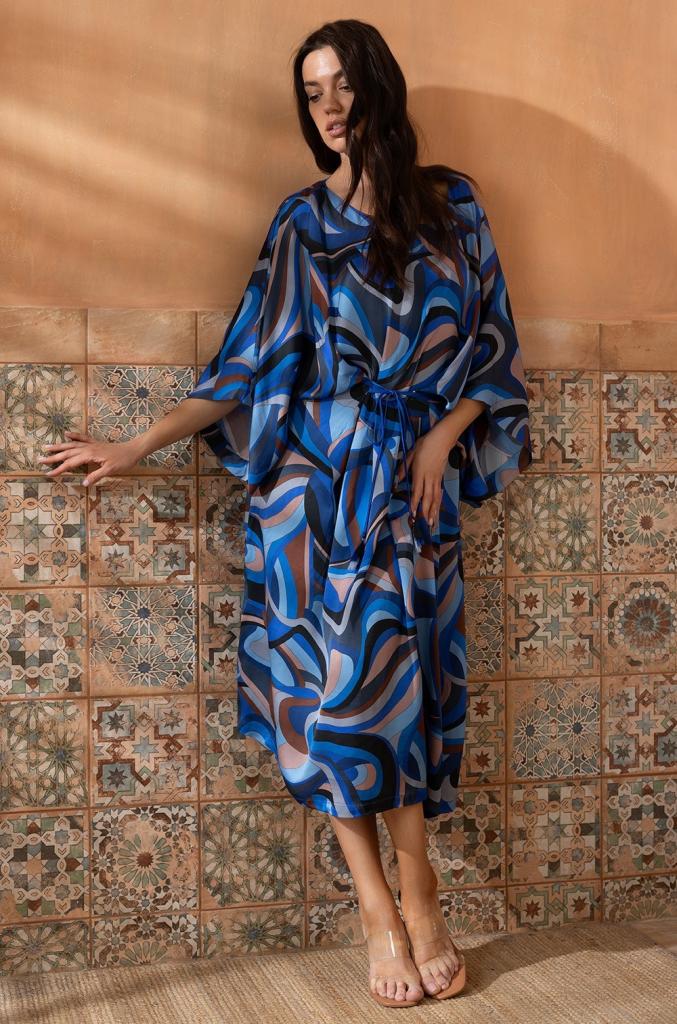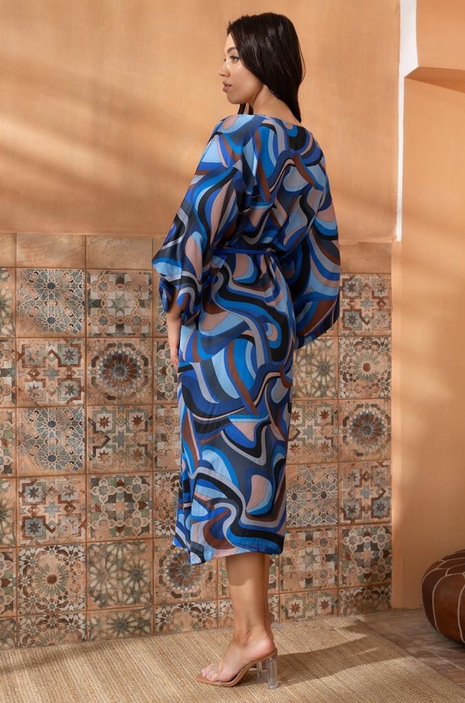 Длинная туника Mia-Amore свободного силуэта с широким рукавом. Изделие выполнено из принтованного смесового шелка . Линию талии можно регулировать за счет узкого пояса, части которого вшиты в вытачки.