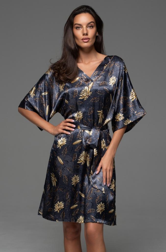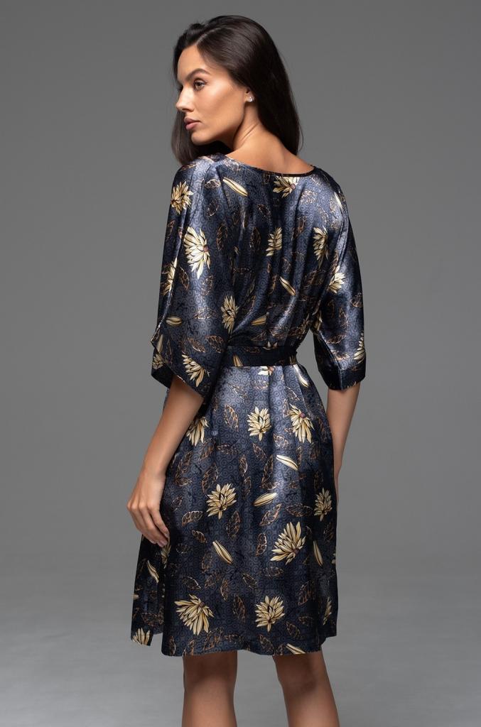 Туника Mia-Amore свободного кроя длиной до колен с цельнокроеными укороченными рукавами выполнена из принтованного смесового шелка. V-образный вырез горловины и низ рукава обработаны обтачками. Туника комплектуется поясом, по бокам расположены карманы.