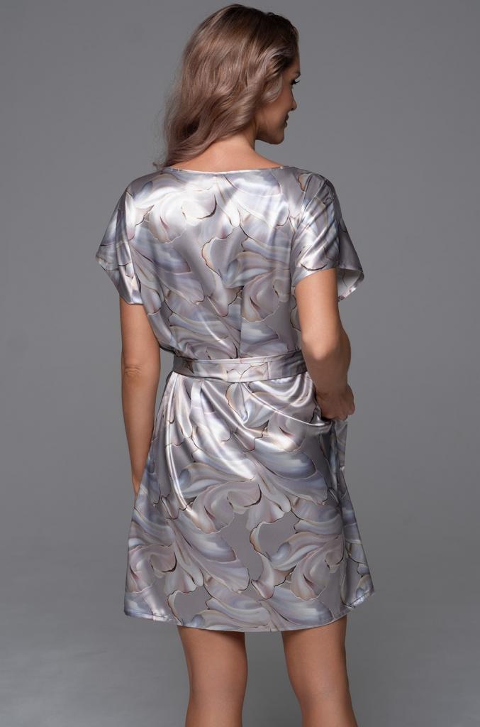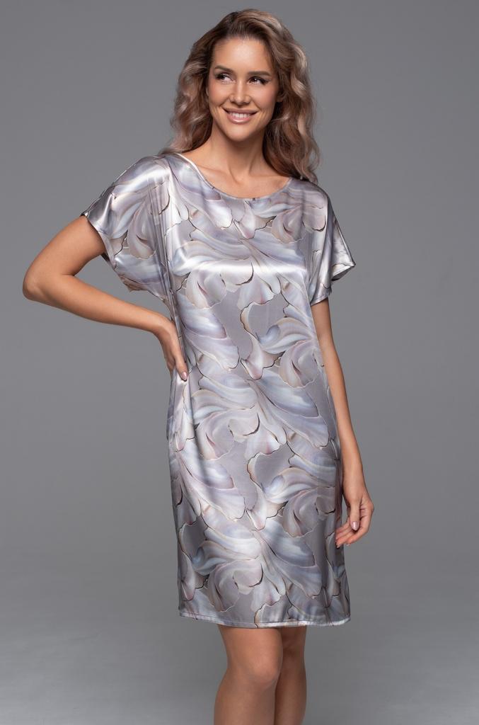 Туника Mia-Amore свободного кроя длиной до колен с цельнокроеными укороченными рукавами выполнена из принтованного смесового шелка. Округлый вырез горловины и низ рукавом обработаны обтачками из принтованного атласа. Туника комплектуется поясом, в боковых швах обработаны карманы.