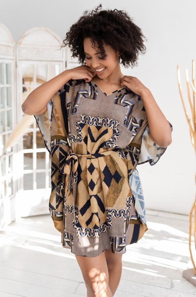 Туника Mia-Amore средней длины, свободного силуэта и с удлиненной линией плеча и V-образным вырезом горловины. Изделие выполнено из тканой вискозы с купонным принтом. Линию талии можно подчеркнуть за счет пояса, который идет в комплекте.