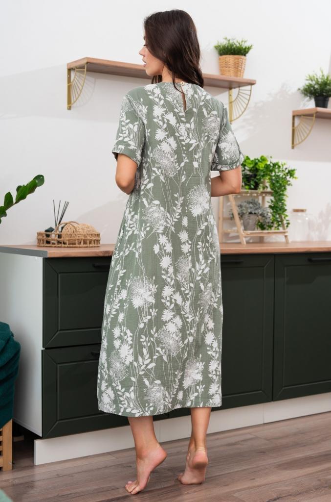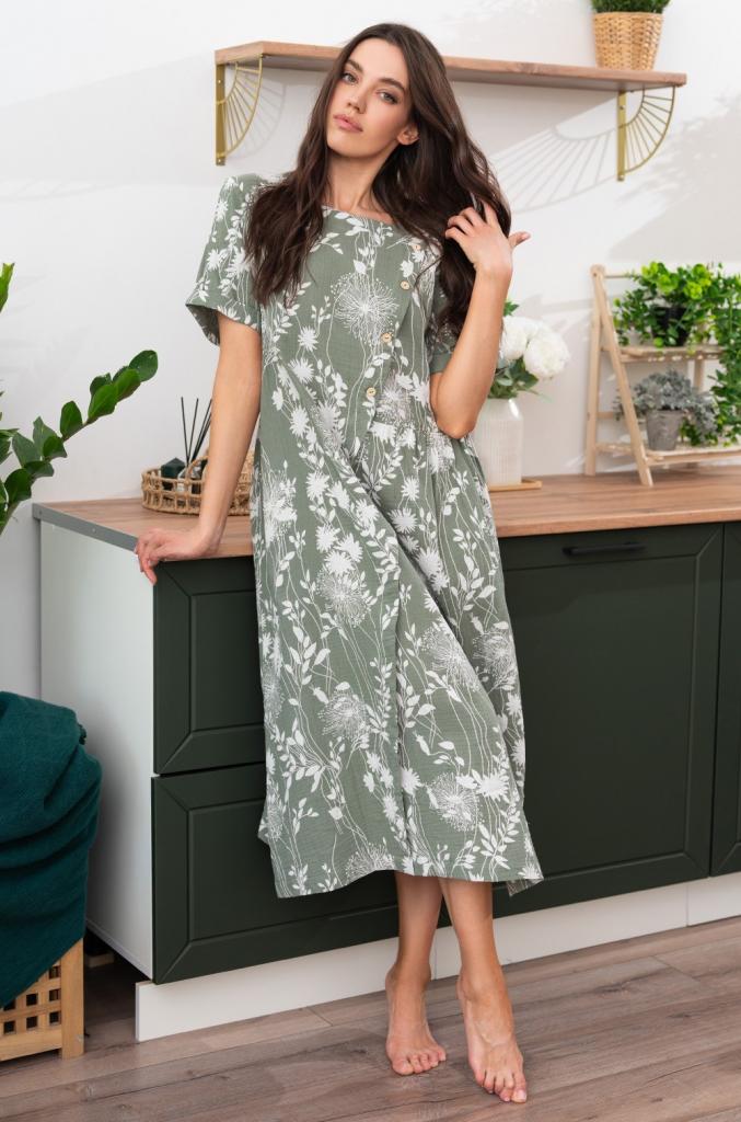 Длинное платье свободного силуэта Mia-Amore выполнено из принтованного хлопкового муслина. У платья короткие рукава. Спереди выполнена ложная имитация запаха и застежки на декоративные пуговицы, в боковых швах карманы.