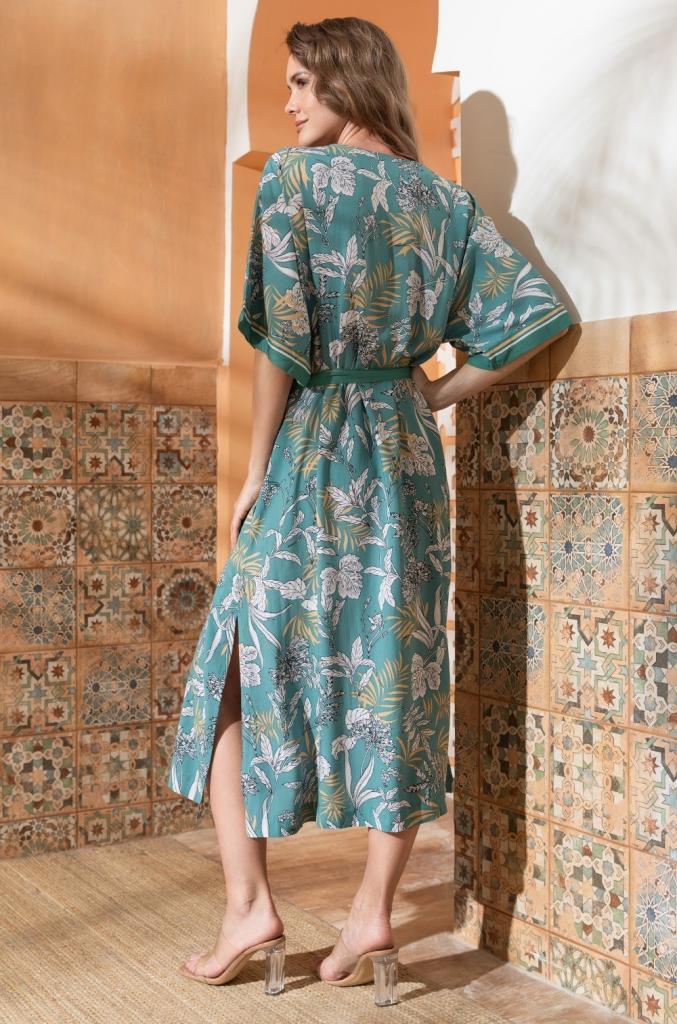 Длинная туника свободного силуэта Mia-Amore выполнена из принтованного вискозного полотна. Рукава, отделка горловины и пояс выполнены из полосатого компаньона. Горловину украшают три декоративные пуговки.