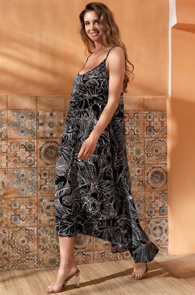 Длинное платье-сарафан Mia-Amore выполнено из принтованной вискозы. Спереди разрез и центральный вертикальный декор эффектно удлиняют силуэт.