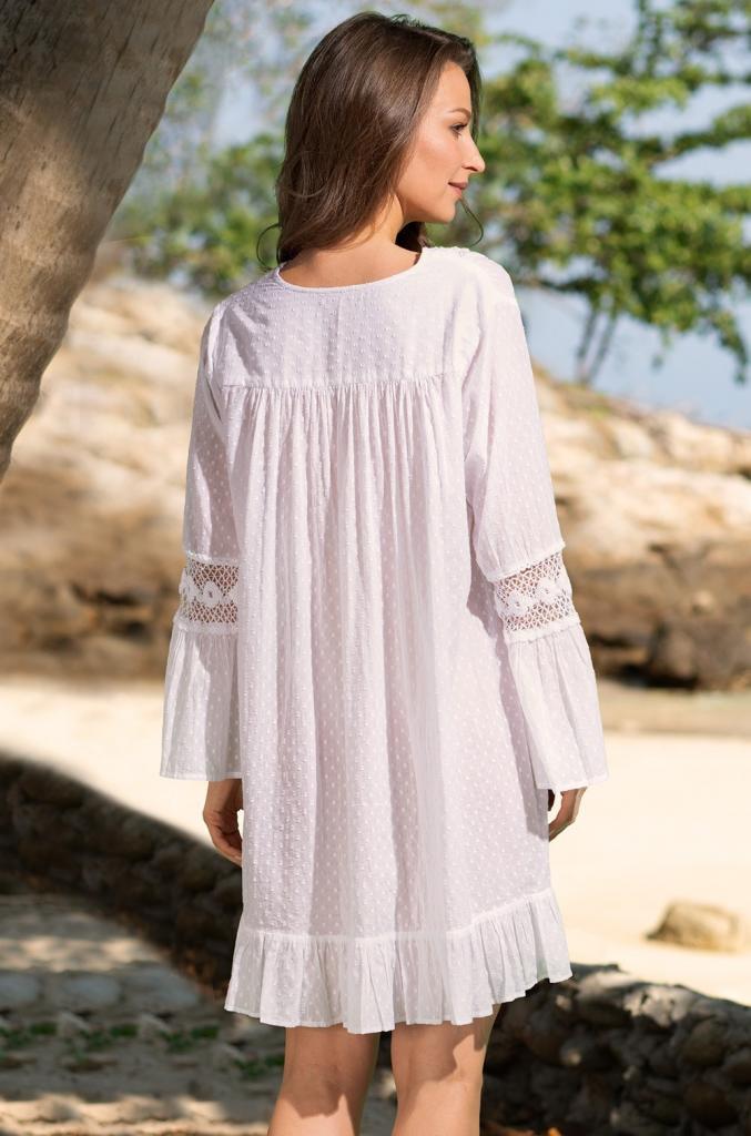 Туника Mia-Amore свободного кроя с длинными рукавами выполнена из фактурного тонкого хлопкового полотна. Горловина, полочка и рукава украшены декоративной вышивкой. По низу рукава и изделия пышная рюша.