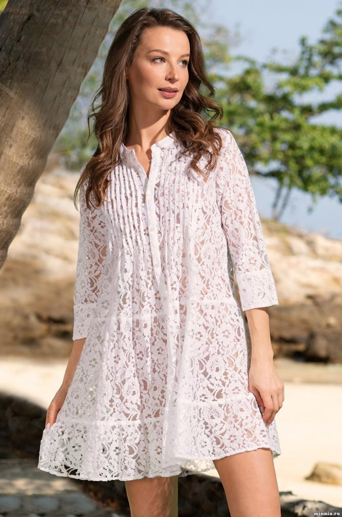 Туника Mia-Amore свободного кроя с рукавами 3/4 выполнена из хлопкового кружевного полотна. По центру полочки застежка на пуговицы.