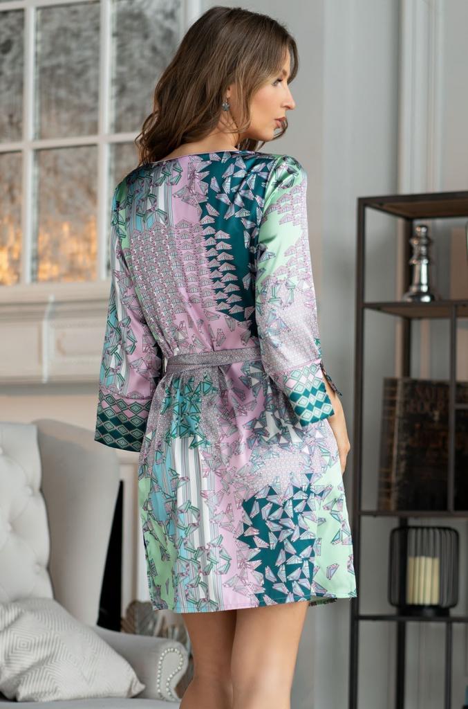 Туника Mia-Amore с фигурным вырезом горловины, свободного силуэта, длиной чуть выше колен. Выполнена из принтованного искусственного шелка с блеском и отделкой в виде контрастных кантов. В боковых швах обработаны карманы, а по низу расположены разрезы. Линию талии можно подчеркнуть за счет пояса, который идет в комплекте.