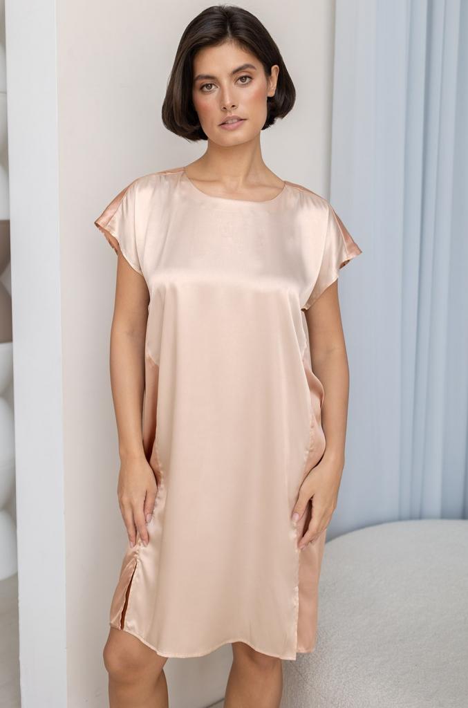 Короткая туника Mia-Amore с удлинённым по спинке низом и с короткими рукавами выполнена из однотонного искусственного шёлка. Спинка выполнена из шёлка кофейного цвета, спереди молочная отделка. В боковых швах карманы, по талии можно завязать пояс.