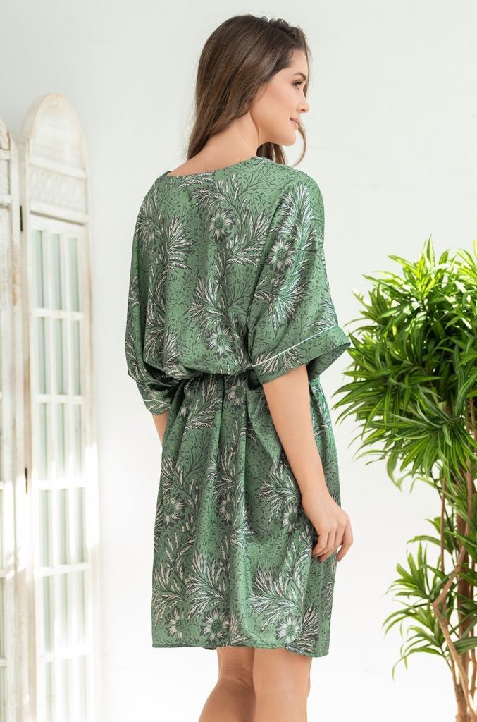 Туника Mia-Amore свободного кроя длиной до колен с цельнокроеными укороченными рукавами выполнена из искусственного принтованного шелка. Округлый вырез горловины и низ рукавом обработаны обтачками. Туника комплектуется поясом, по бокам расположены карманы.