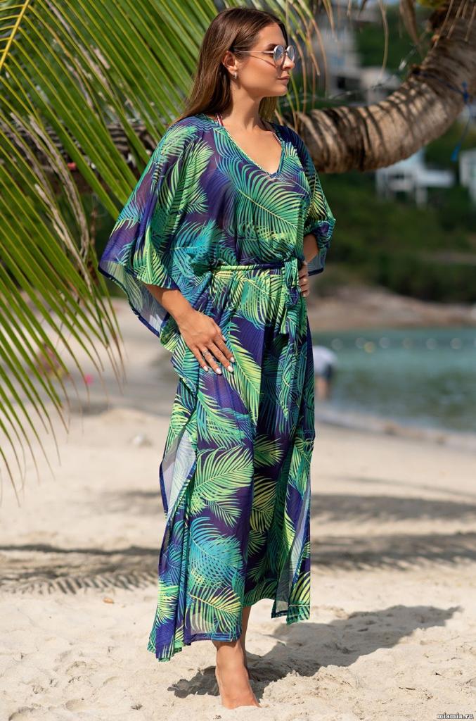 Длинная туника Mia-Amore свободного силуэта со спущенными рукавами выполнена из тонкой гигроскопичной мягкой принтованной сетки. Сетка принтована ярким рисунком в виде пальмовых листьев разных оттенков - от салатового до глубокого изумрудного. Ширина туники может регулироваться по талии поясом.