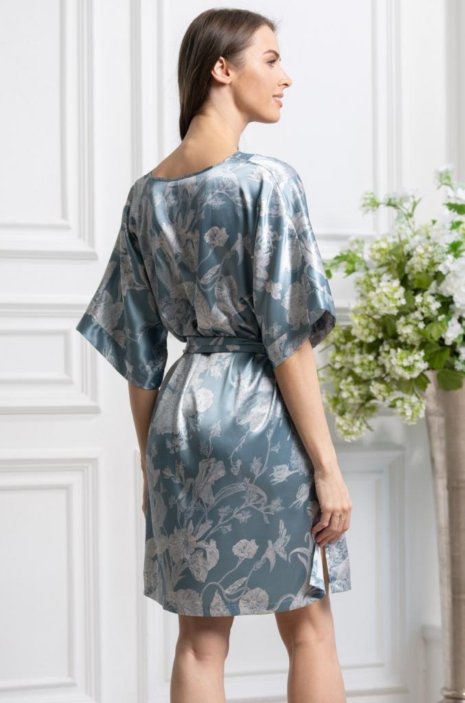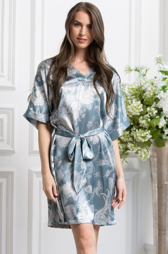 Базовая туника Mia-Amore свободного силуэта, со спущенными плечами, длиной до колен. Туника выполнена из смесового принтованного шёлка нежного ментолового цвета. В боковых швах туники удобные карманы и разрезы по низу. По талии тунику можно украсить съёмным поясом.