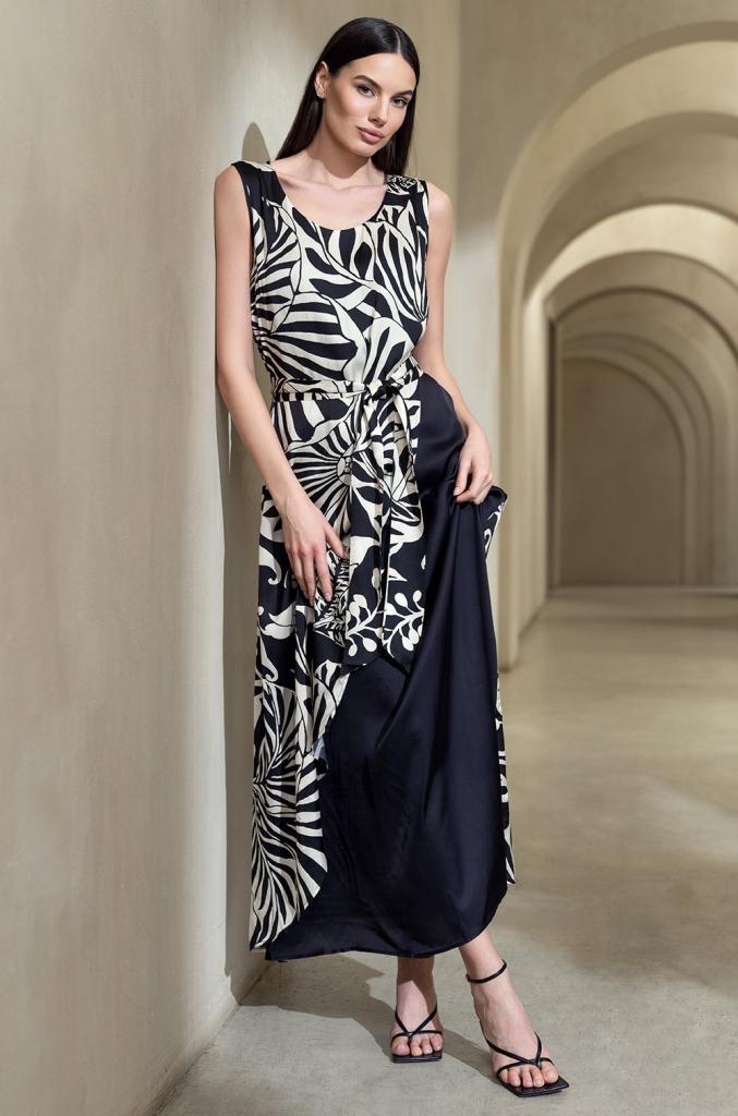 Длинный сарафан Mia-Amore свободного силуэта. Изделие выполнено из комбинации принтованного и однотонного смесового шелка. Линию талии можно подчеркнуть за счет пояса, который идет в комплекте.