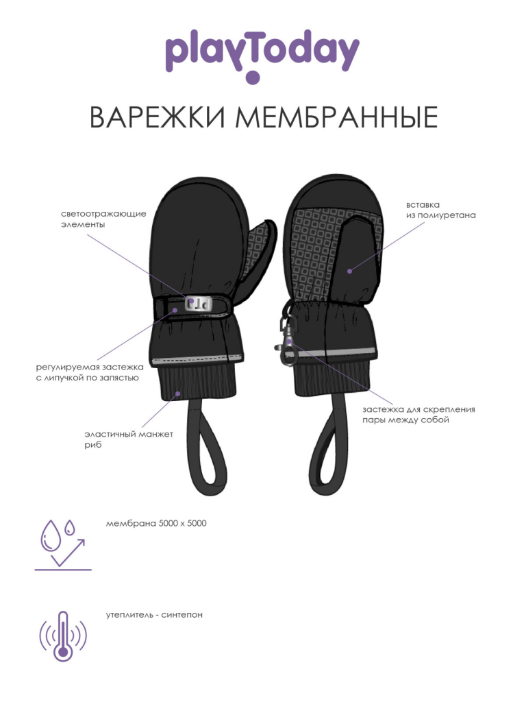 Зимние варежки-краги с мембраной. Утеплитель - синтепон. Мягкая ладошка из влагостойкого полиуретана. Регулируемая застёжка с липучкой по запястью. Застежка для скрепления пары между собой. Эластичный манжет. Светоотражающие элементы.