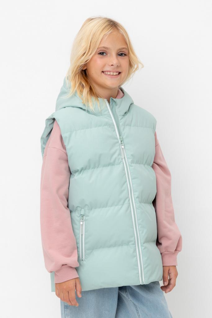 Стеганый жилет с капюшоном для девочки с утеплителем Fellex®: 120 г/м2. Выполнен из мембранной ткани с дополнительной тефлоновой обработкой. Данный вид обработки предохраняет изделие от загрязнения и лучше отводит влагу. Подклад из 100% полиэстра. Капюшон не снимается. Изделие застёгивается на молнию, предусмотрена защита подбородка. Два кармана по бокам застёгиваются на молнии. Во всех изделиях верхнего ассортимента для безопасности ребенка предусмотрены светоотражающие элементы.