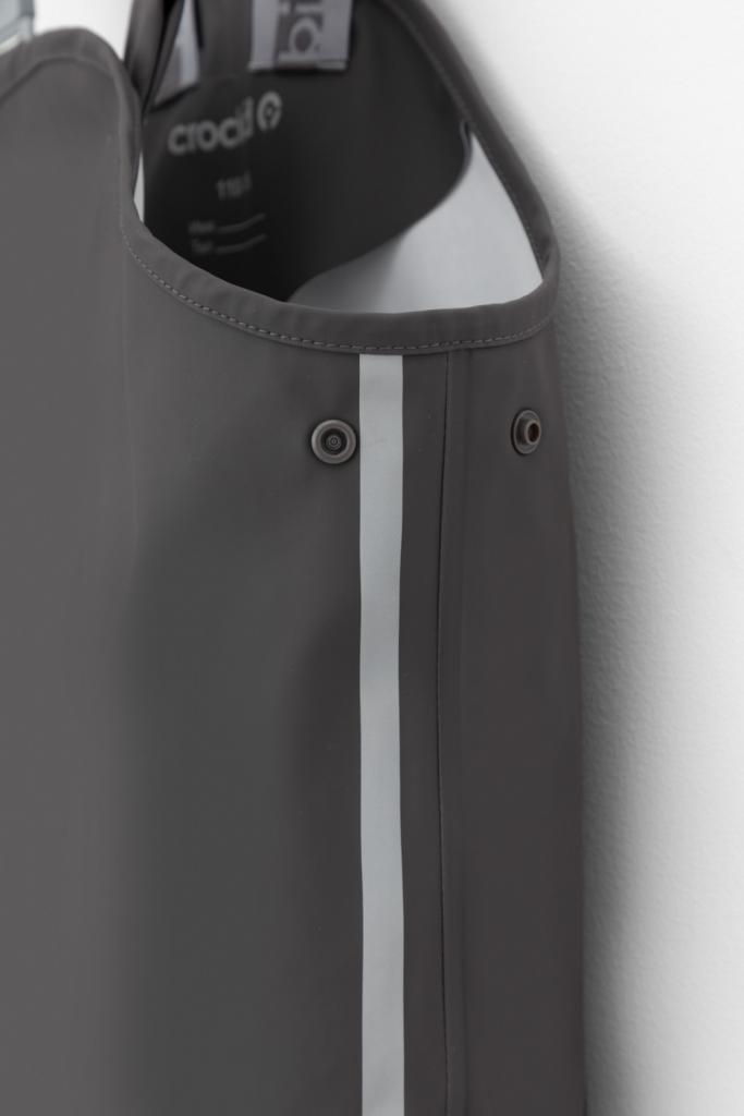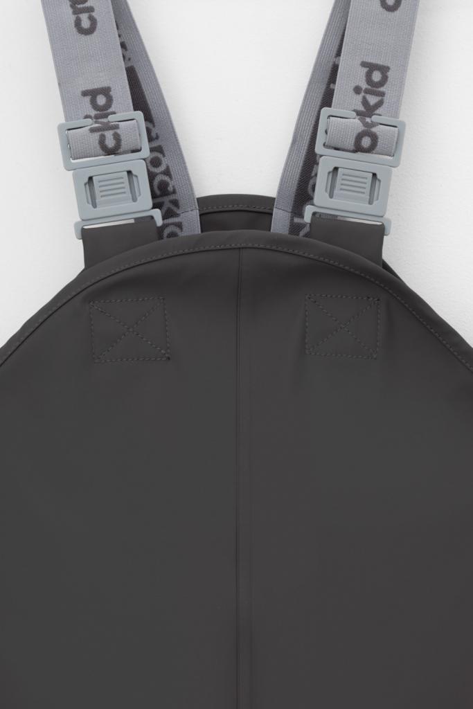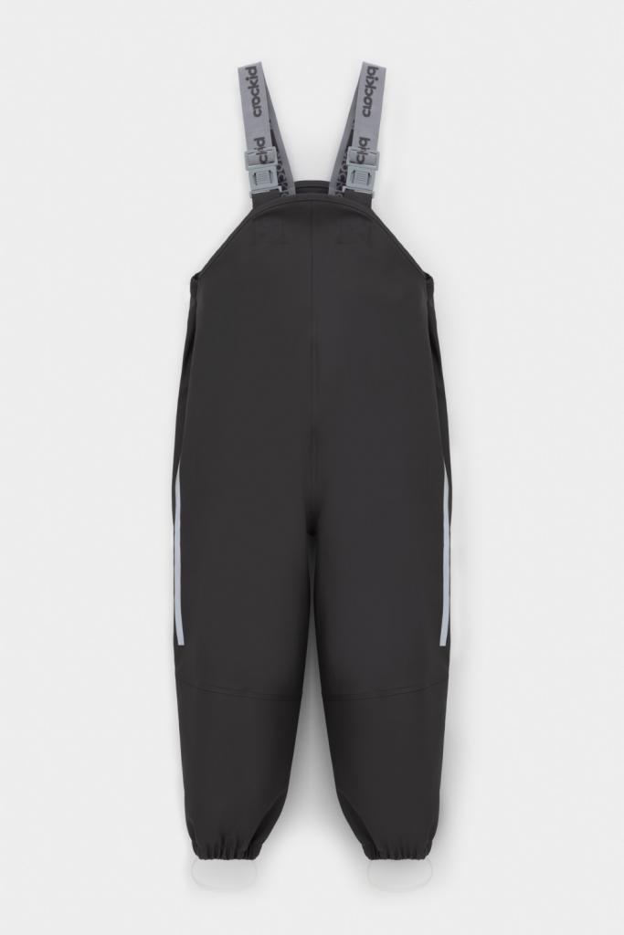Полукомбинезон без подкладки, непромокаемый, на эластичных бретелях с регулировкой длины при помощи фастекса, сбоку под проймой кнопки для регулировки объема, низ брючин с эластичной резинкой. Для фиксации полукомбинезона используются съемные силиконовые штрипки. Светоотражающий принт в виде полосы сбоку.