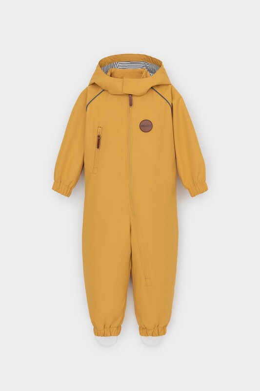 Ветровочный комбинезон ясельный из мембранной ткани с дополнительной тефлоновой обработкой. Данный вид обработки предохраняет изделие от загрязнения и лучше отводит влагу. Подклад из 100% хлопка. У изделия удлиненная молния для легкого одевания с защитой подбородка. Утяжка на капюшоне с потайными стопперами. По низу рукавов и брючин, а также на спинке изделия эластичная резинка для лучшего прилегания. Для фиксации комбинезона используются съемные силиконовые штрипки. В размерах 68-74 и 74-80 функциональные отвороты на рукавах и брючинах. Во всех изделиях верхнего ассортимента для безопасности ребенка предусмотрены светоотражающие элементы.