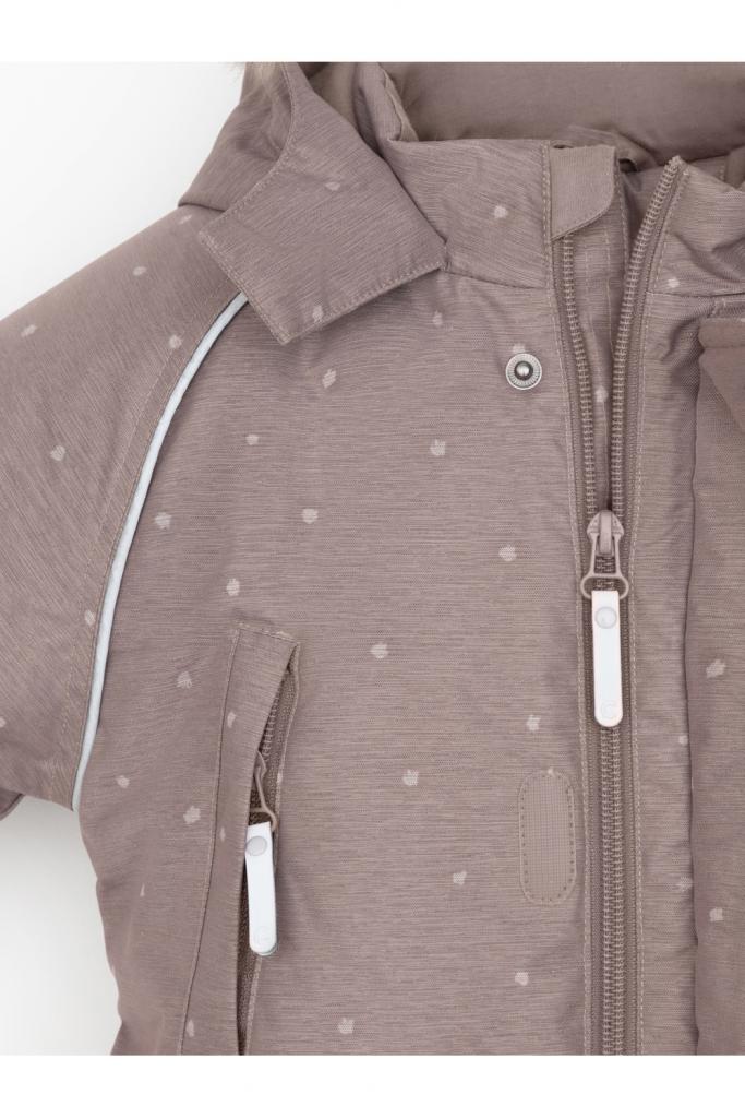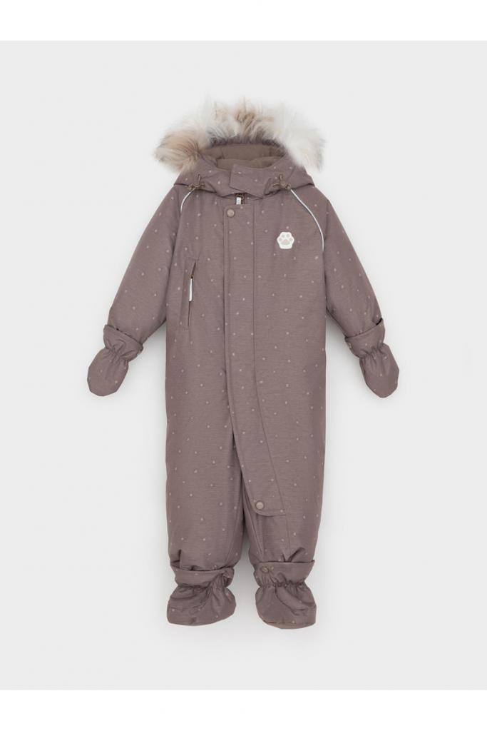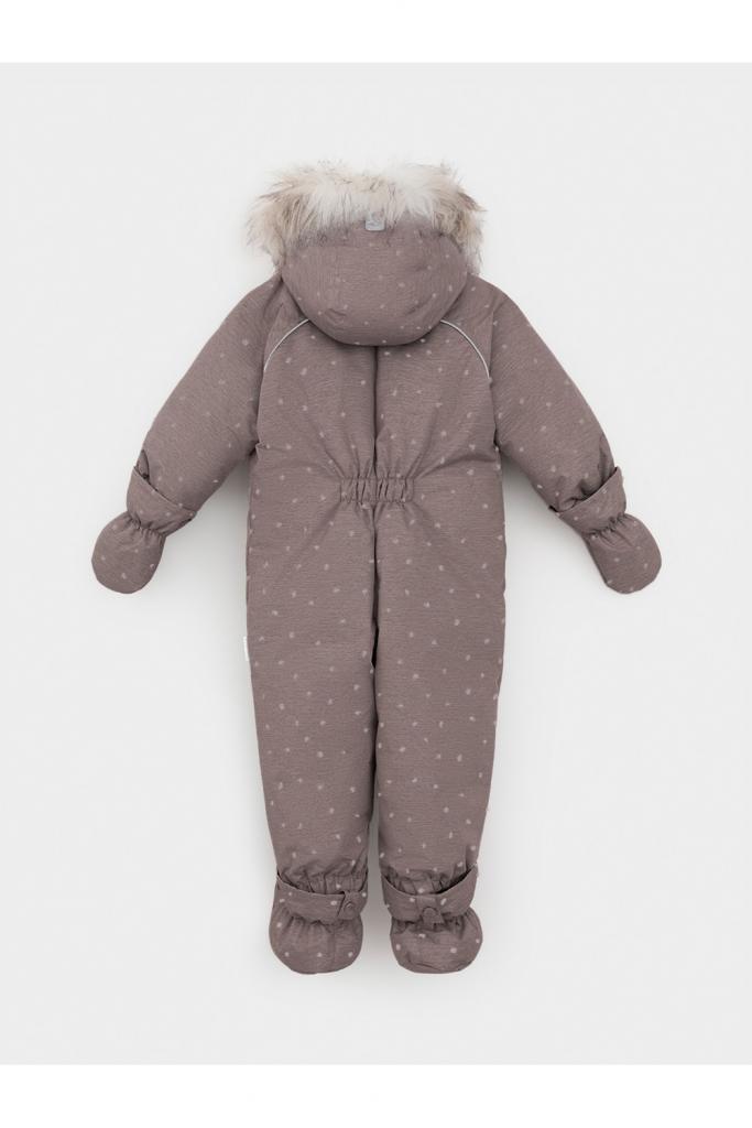 Зимний комбинезон ясельный с натуральным утеплителем из гусиного пуха (70%) и пера (30%). Выполнен из мембранной ткани с дополнительной тефлоновой обработкой, которая предохраняет изделие от загрязнений и отталкивает влагу. Подклад выполнен из 100% хлопка. Комбинезон застёгивается на молнию и внешнюю планку на липучках, предусмотрена защита подбородка. Несъёмный капюшон имеет эластичную утяжку со стопперами и отстёгивающийся мех на молнии. Резинка по спинке для лучшего прилегания. На груди карман на молнии. По рукавам и низу изделия эластичные манжеты, на ножках отстёгивающиеся силиконовые штрипки. В размерах с 68-74 по 80-86 в комплекте идут рукавицы и пинетки. Во всех изделиях верхнего ассортимента для безопасности ребёнка предусмотрены светоотражающие элементы.