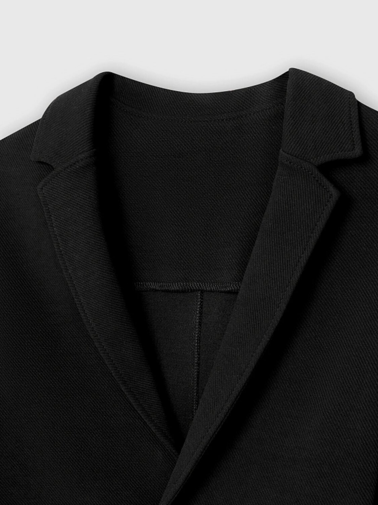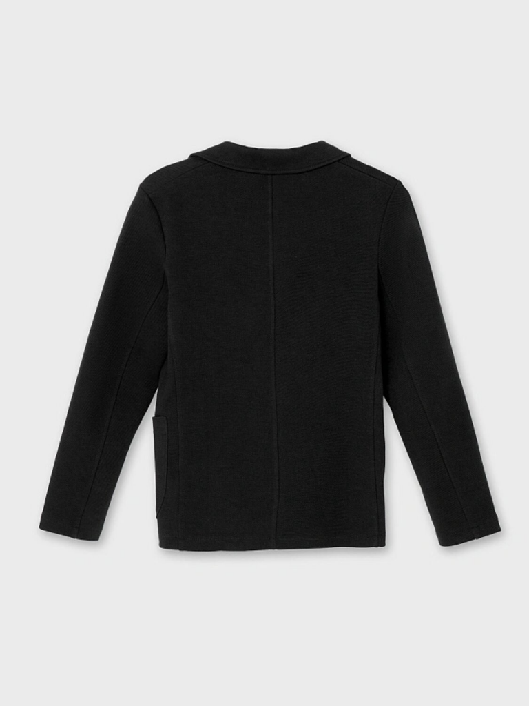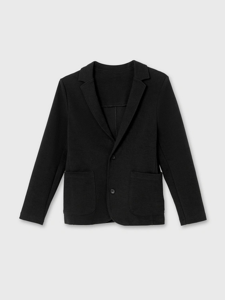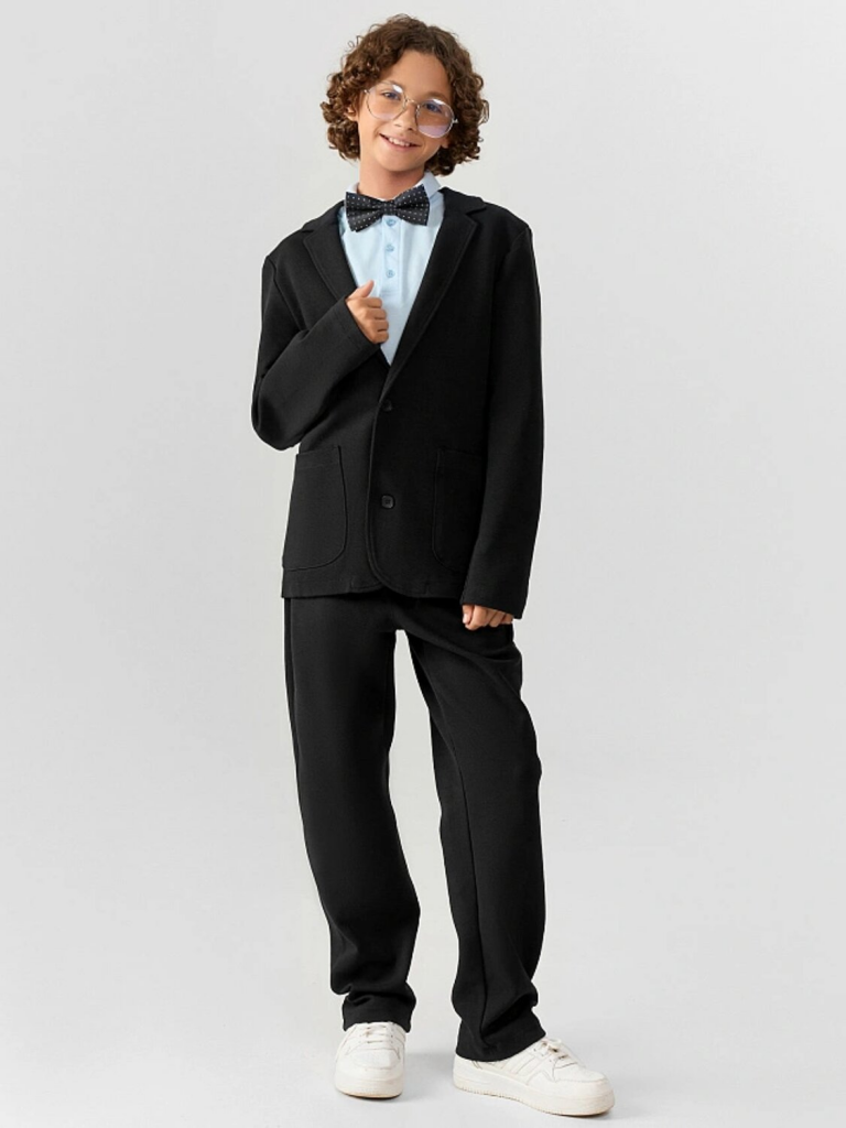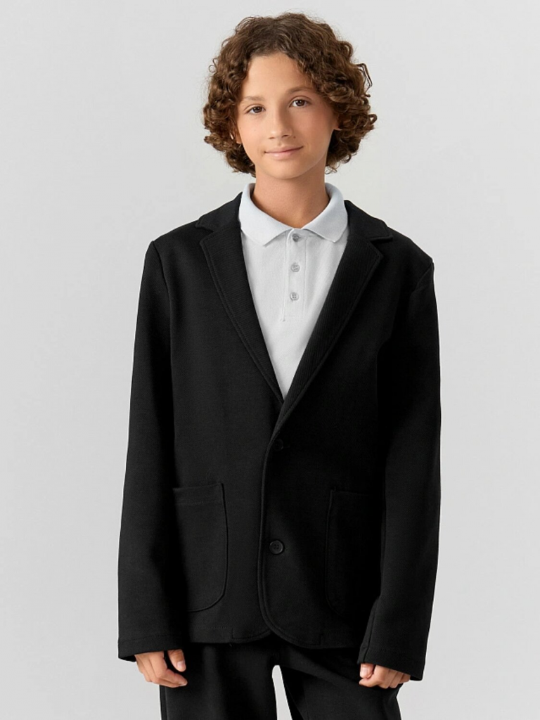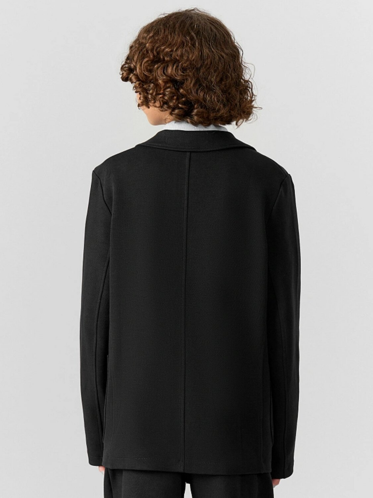Однобортный жакет для мальчиков прямого силуэта. Без подкладки. С накладными карманами. Рукава двухшовные длинные втачные. Застежка на 2 пуговицы. Низ жакета и рукавов обработан на плоскошовной машине швом в подгибку.