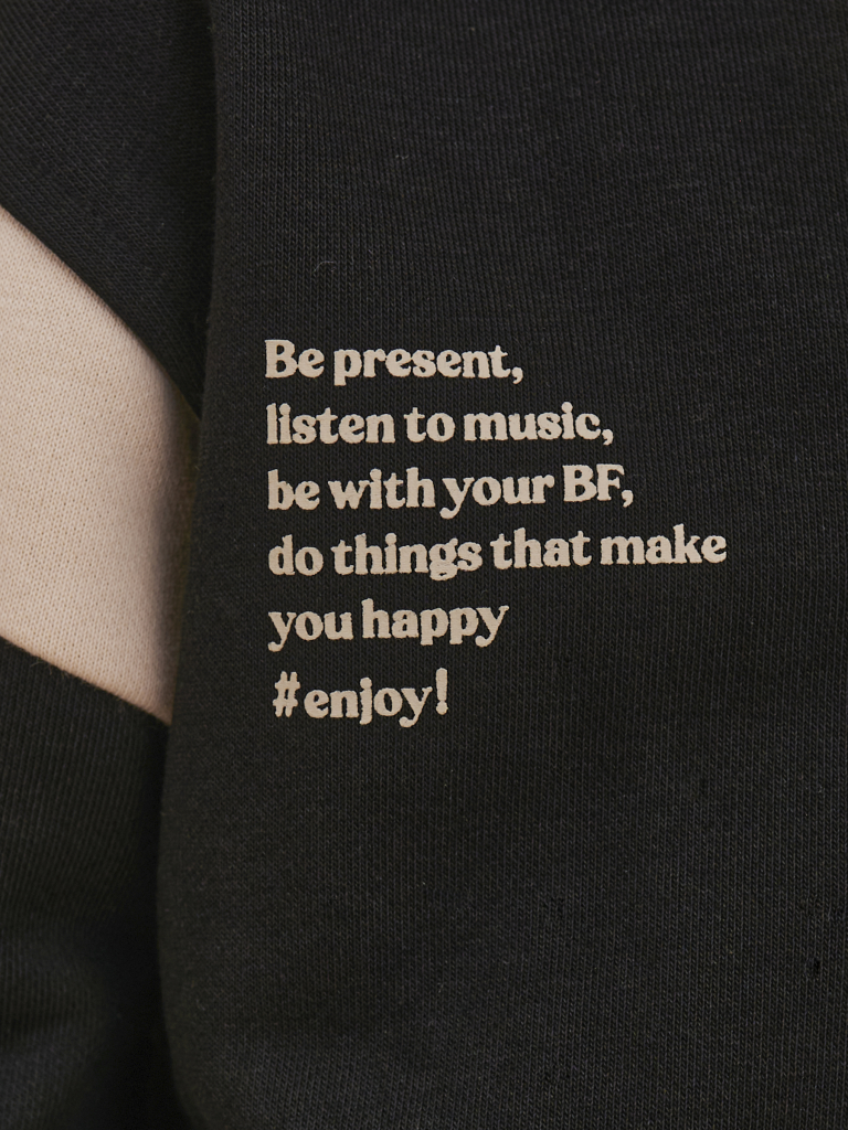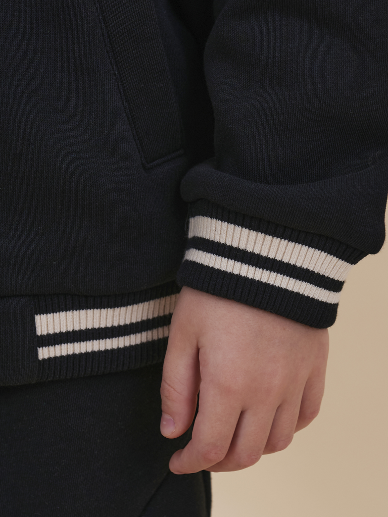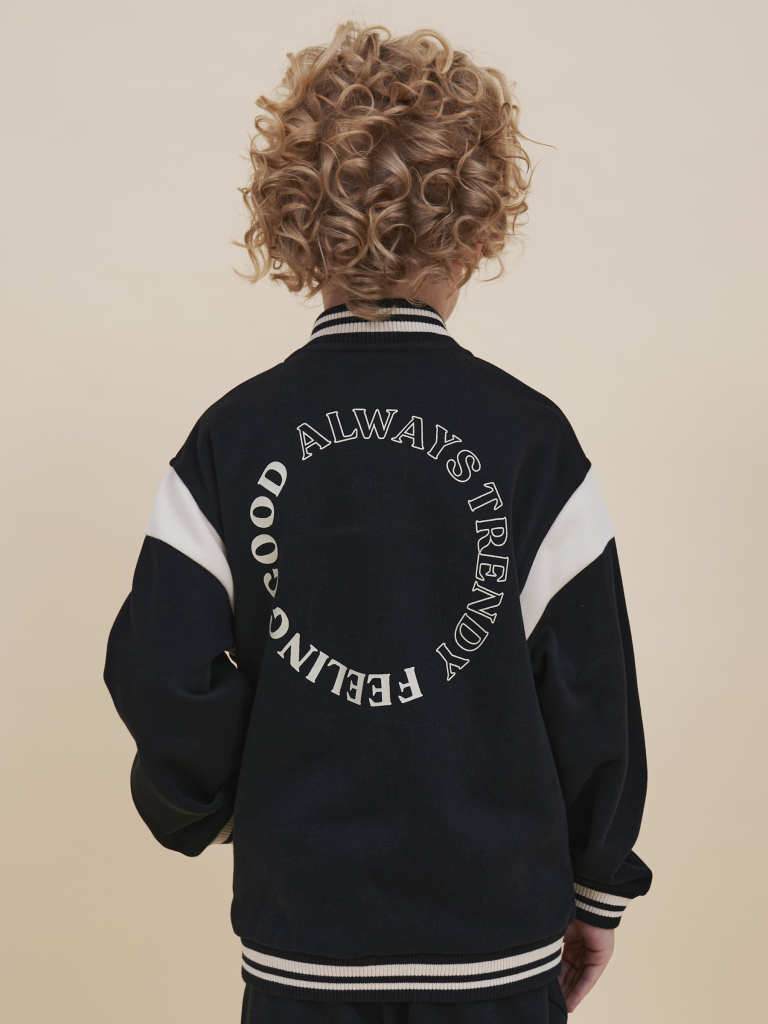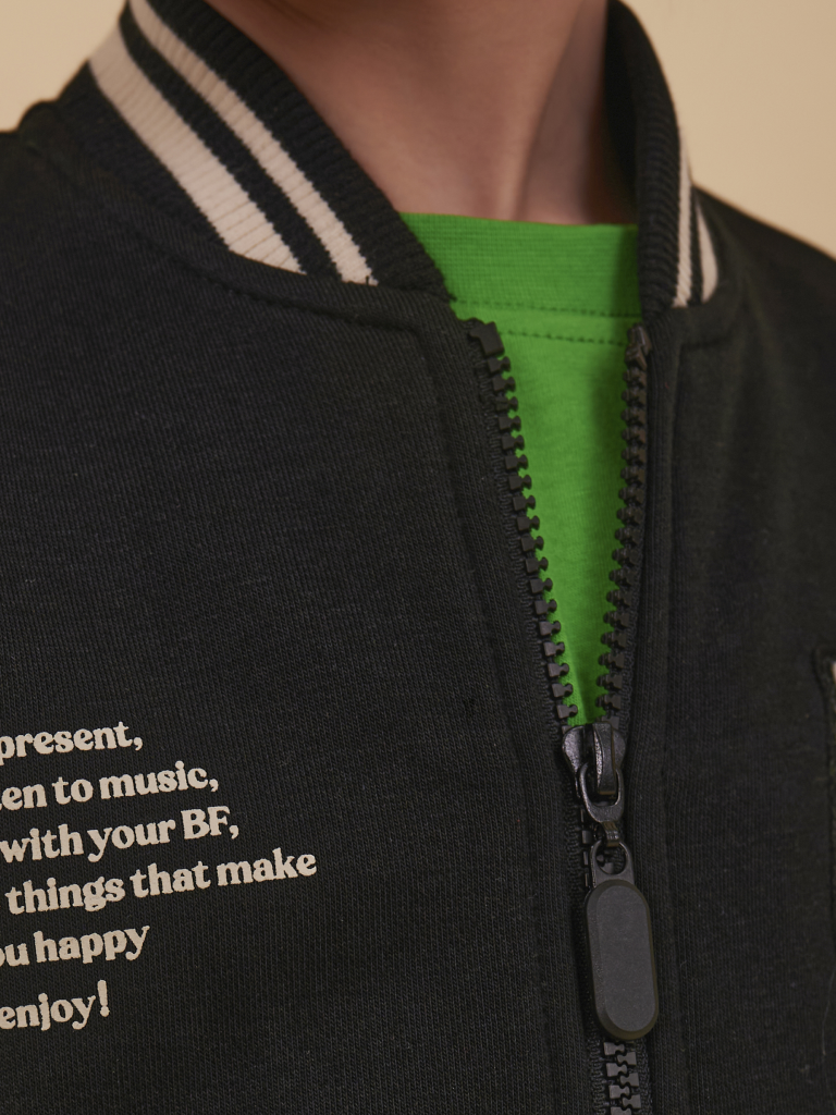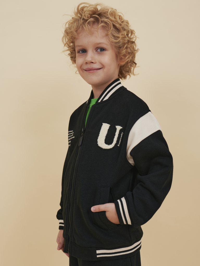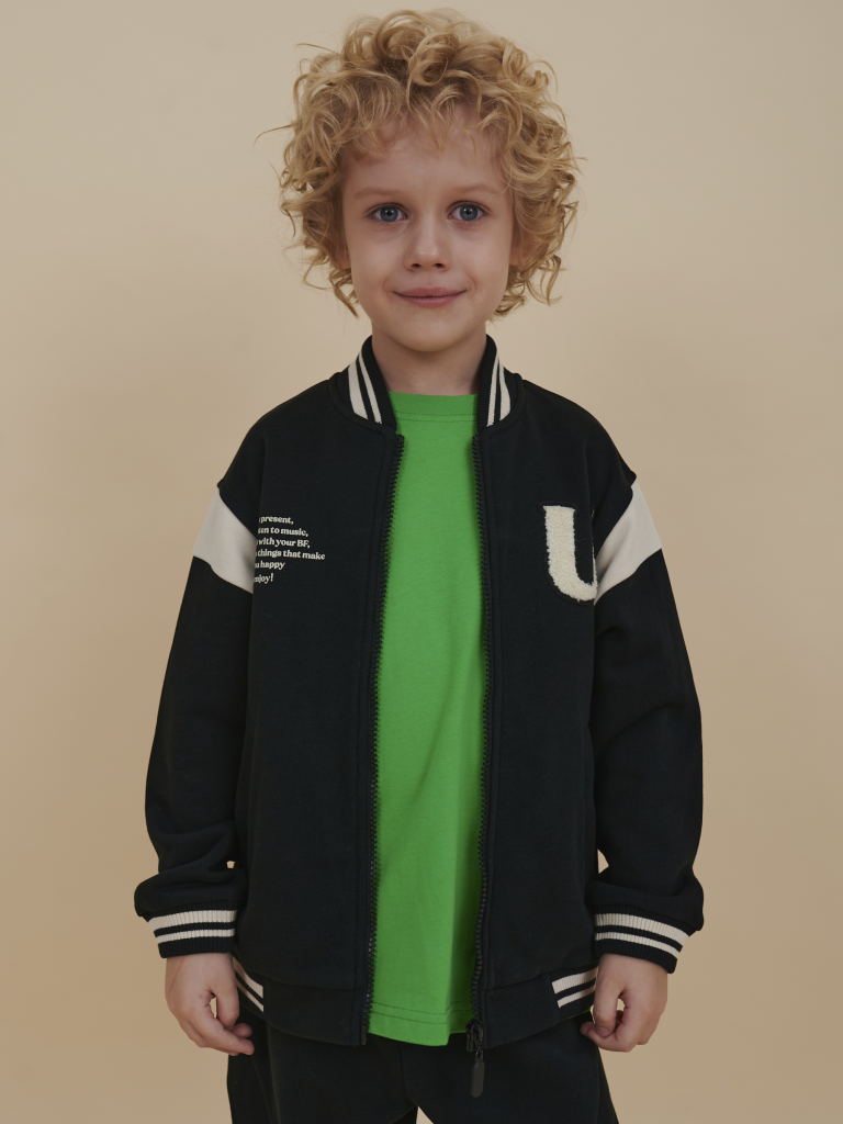 Бомбер для мальчика – трикотажная модель свободного кроя на позднюю весну, лето. Уютная вещь для создания стильного образа. Жакет для мальчика легко сочетать с любым низом, использовать для многослойных образов. Куртка бомбер для мальчика идеальна в качестве плотной кофты для прохладного помещения. Трикотажная куртка выполнена из смесовой ткани с высоким содержанием хлопка и небольшим добавлением полиэстера. Материал хорошо пропускает воздух, обеспечивает здоровую гигроскопичность. Ребенок не потеет и комфортно чувствует себя во время активных игр и занятий спортом. Наличие полиэстера наделяет жакет для мальчика повышенной износоустойчивостью к усадке, защитой от образования катышек. Изделие не линяет после стирки и сохраняет красивый внешний вид. Детский бомбер на центральной застежке молнии, со спущенным плечом и углубленной проймой. Воротник, манжеты по рукавам и низу изделия - из декоративного полосатого риба – стильная резинка в университетском стиле. На рукавах вставки из основного материала контрастного цвета. Боковые карманы с листочками расположены на переде под наклоном. Детский жакет для мальчика украшен модным университетским шрифтом с засечками. Перед декорирован нашивкой – объемной мягкой аппликацией из бербер-флиса (барашек) и графичной шрифтовой композицией. Меховая нашивка буквой "U": unity – перевод "единство, командная сплоченность". Надпись: "Be present, listen to music, be with you BF, do things that make you happy #enjoy!" - перевод "Живи в моменте, слушай музыку, встречайся со своим лучшим другом, делай то, что делает тебя счастливым #наслаждайся!". На спине круговая шрифтовая композиция: "Feeling good always trendy" - перевод "Хорошее настроение всегда в тренде (модно)". Куртка бомбер для мальчика подростка представлена в размере для малышей и школьников. Размерная линейка: 1 (86): 2 (92): 3 (98): 4 (104): 5 (110): 6 (116): 7 (122): 8 (128): 9 (134): 10 (140): 11 (146). Бомбер для мальчика - отличный подарок для сына, внука, братика, племянника, крестника! Выбирайте нужный размер по таблице размеров на фото. Цвет товара на экране вашего устройства может отличаться от цвета изделия вживую.