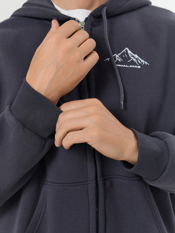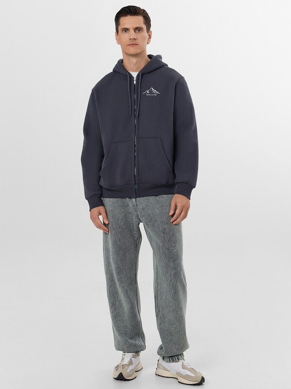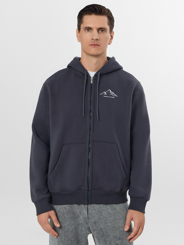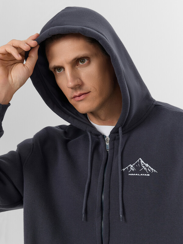 Серый мужской жакет на молнии с капюшоном — универсальная модель для повседневного гардероба. Изделие выполнено из качественного футера с мягким начесом, который обеспечивает тепло и комфорт в прохладную погоду. Прямой свободный силуэт подчеркивает современный стиль, а уютный капюшон и длинные рукава на манжетах добавляют практичности.