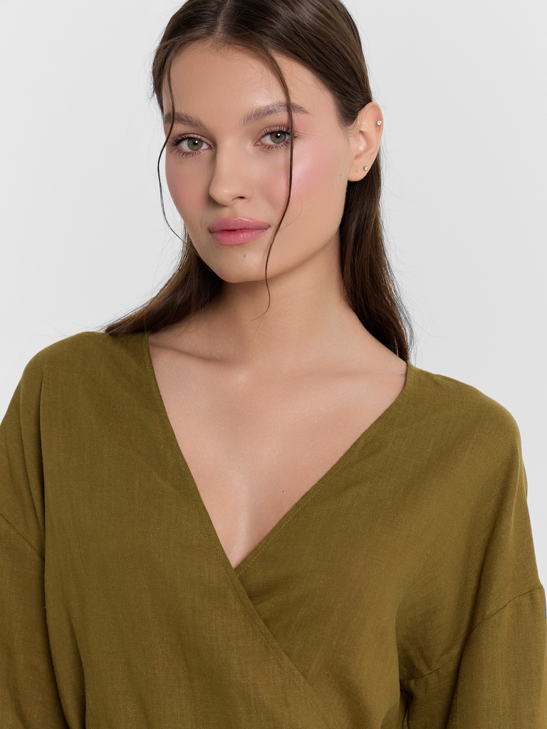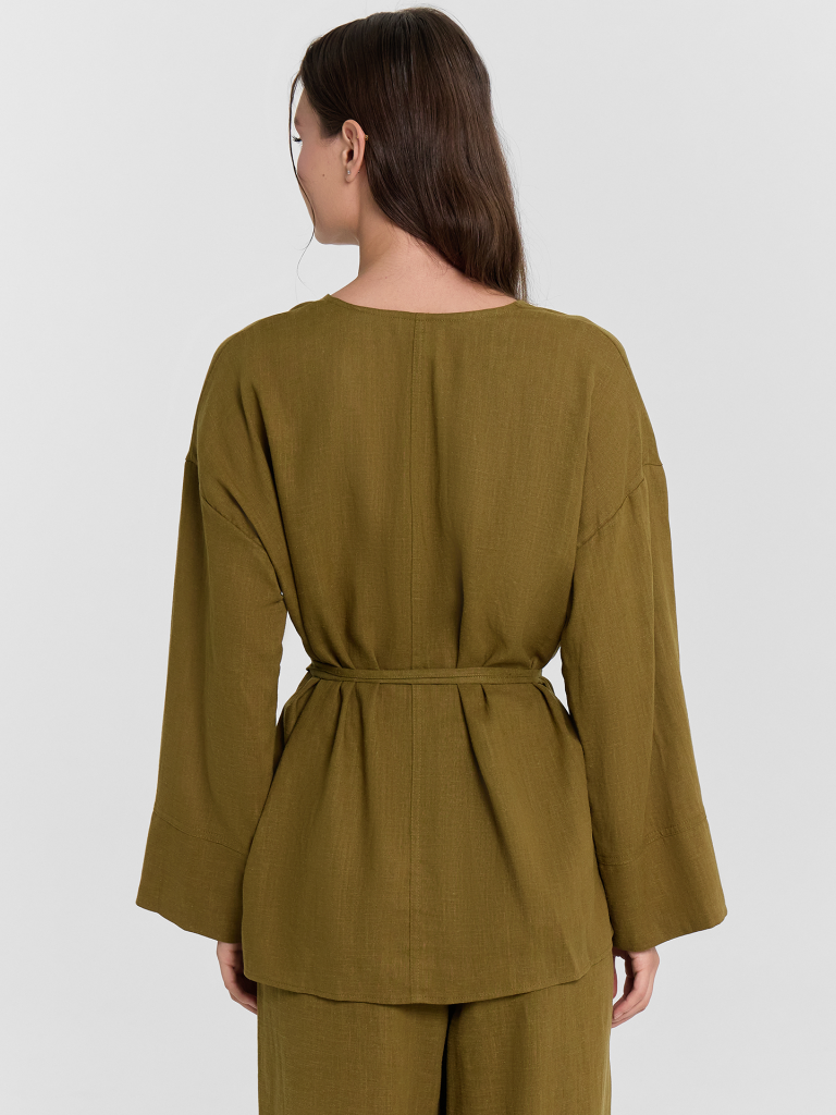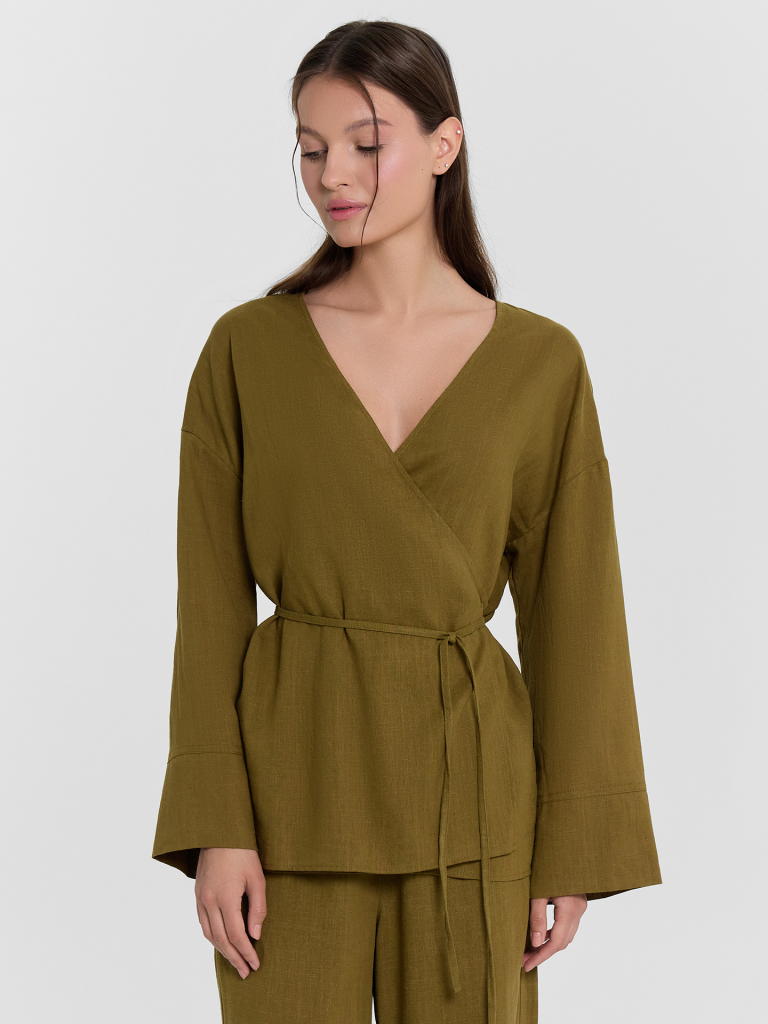 Женский жакет свободного кроя — сочетание комфорта и элегантности. Длинные рукава с широкими манжетами добавляют выразительности, а спущенное плечо создает расслабленный силуэт. Застежка на запах с завязками подчеркивает женственность, а V-образный вырез делает образ утонченным. Материалы — рами и лиоцелл — обеспечивают легкость, воздухопроницаемость и приятные тактильные ощущения. Они устойчивы к износу, хорошо держат форму и дарят комфорт в течение всего дня. Дополните этот жакет подходящими брюками из коллекции Mark Formelle, чтобы создать гармоничный и стильный комплект.