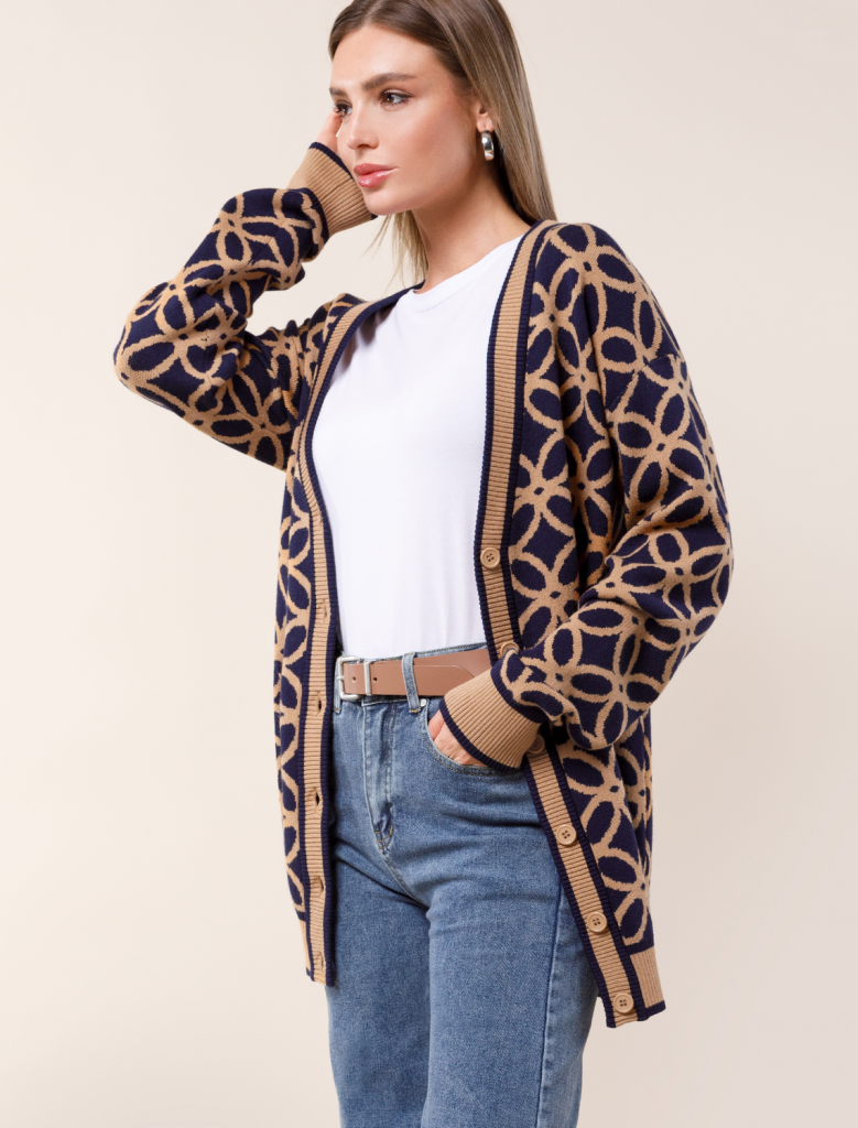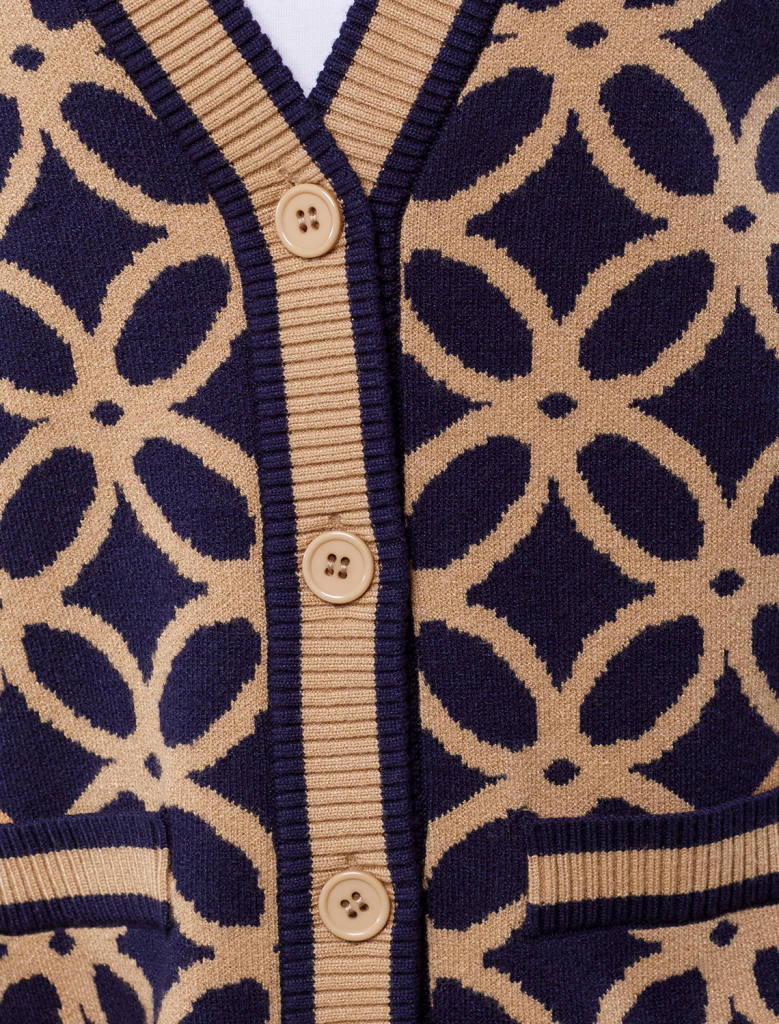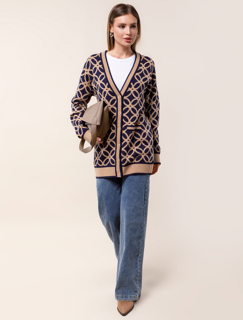 Кардиган жаккардовой вязки выполнен из нежной пряжи на основе вискозы с добавлением кашемира. Мягкая модель не раздражает кожу, приятно ощущается на теле и поддерживает комфортный микроклимат. Совет стилиста: модель гармонично впишется в любой гардероб, добавив образу выразительности. Сочетайте с однотонными брюками, юбкой, платьем или джинсами
