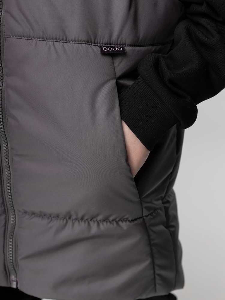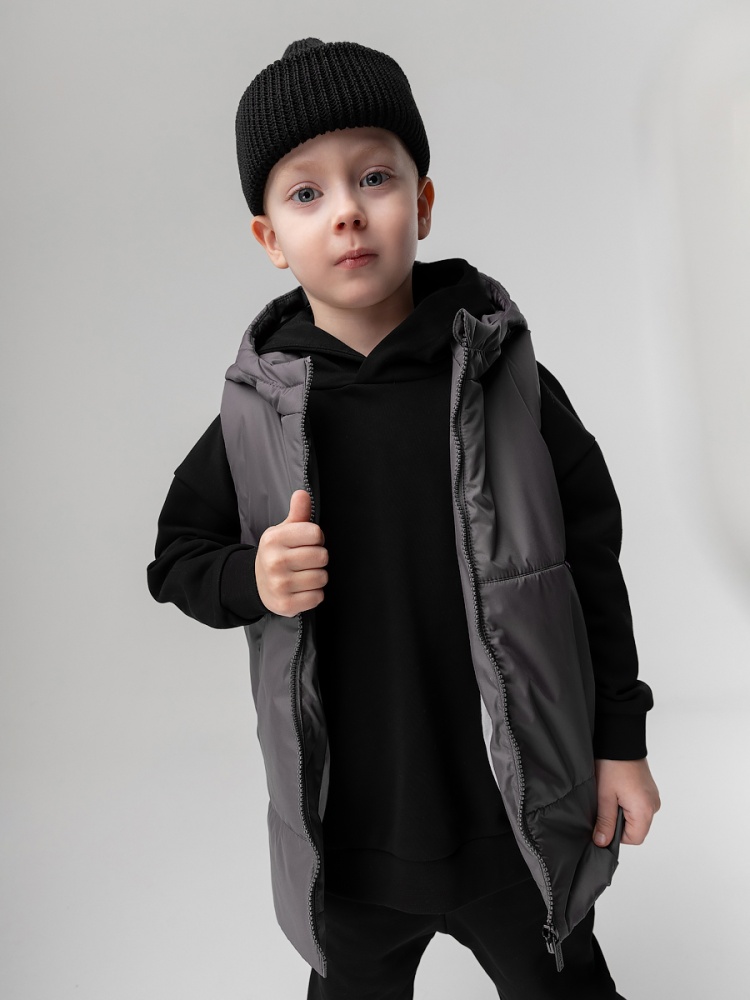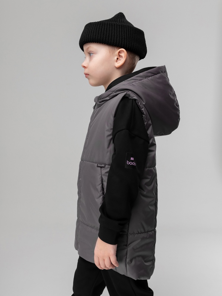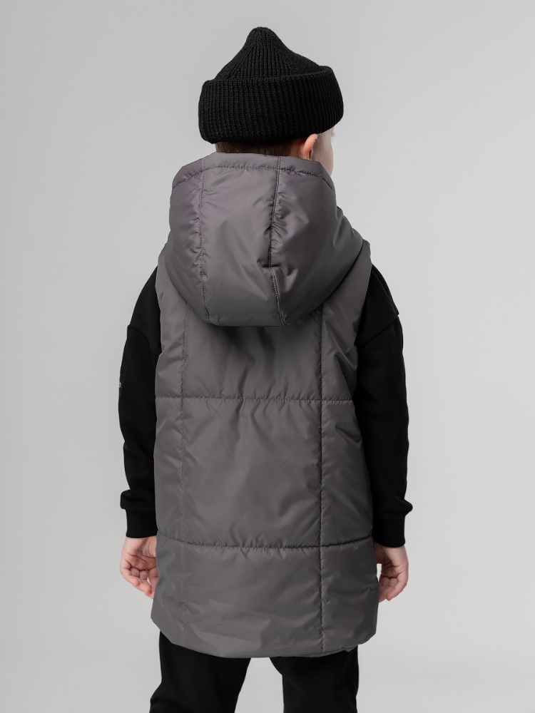 Стильный жилет на молнии, по бокам прорезные карманы, несъемный капюшон.Материал жилета Дюспо воздухообменный и ветрозащитный. Материал верха: Дюспо 100% полиэстер, утеплитель Hetta Filt S2 150 г/кв.м, подкладочный материал кулирная гладь 100% хлопок