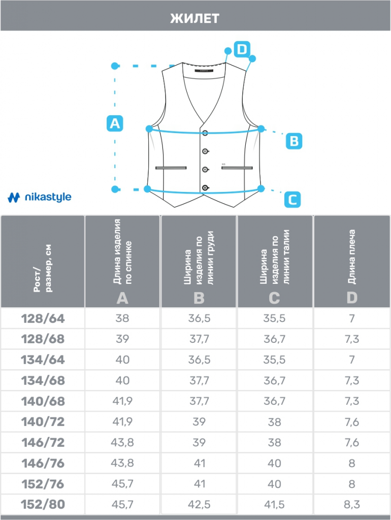 Жилеты представлены в каждом росте двумя размерами.