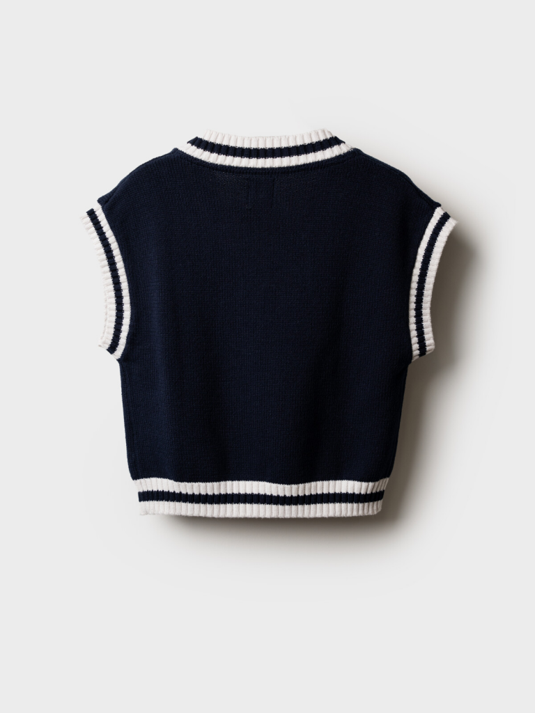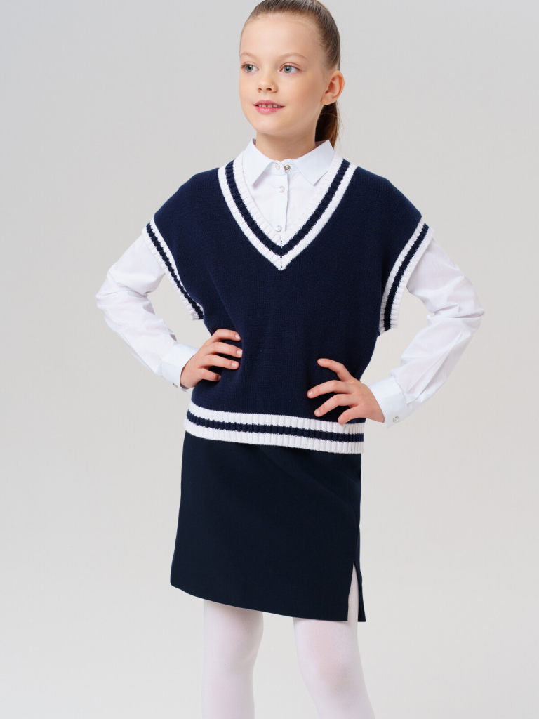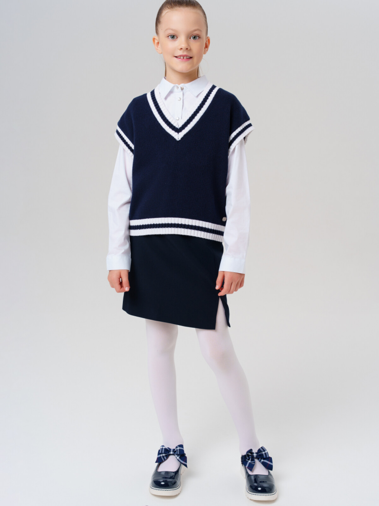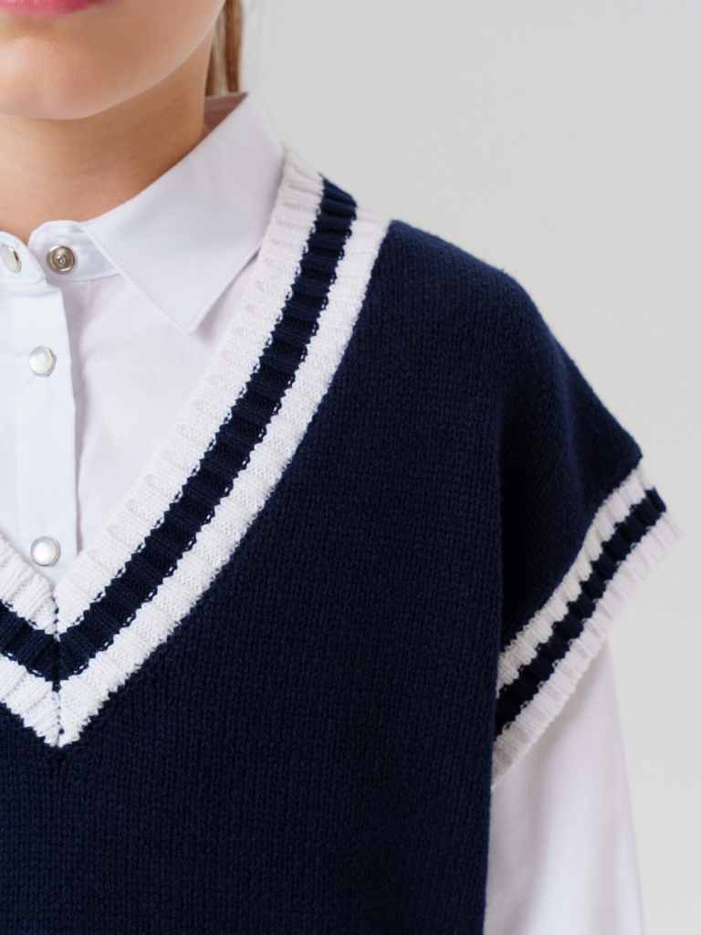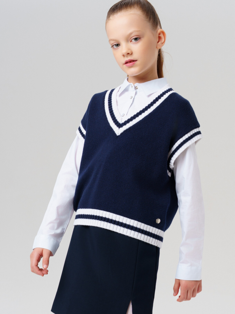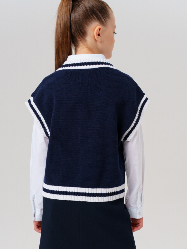 Стильный школьный укороченный темно-синий жилет для девочки подростка.Этот модный жилет для школы станет универсальным элементом гардероба юной модницы. Модель выполнена в comfort силуэте - свободный крой обеспечивает комфорт в движении и современный внешний вид.Почему стоит выбрать:Идеально подходит для школы - сочетает удобство и аккуратный внешний видУдобный крой не сковывает движенияСтильный дизайн понравится подросткам, следящим за модойОтличный вариант для повседневной носки и школьных будней. Качественные материалы и продуманный крой делают этот жилет практичным выбором для девочки школьницы.