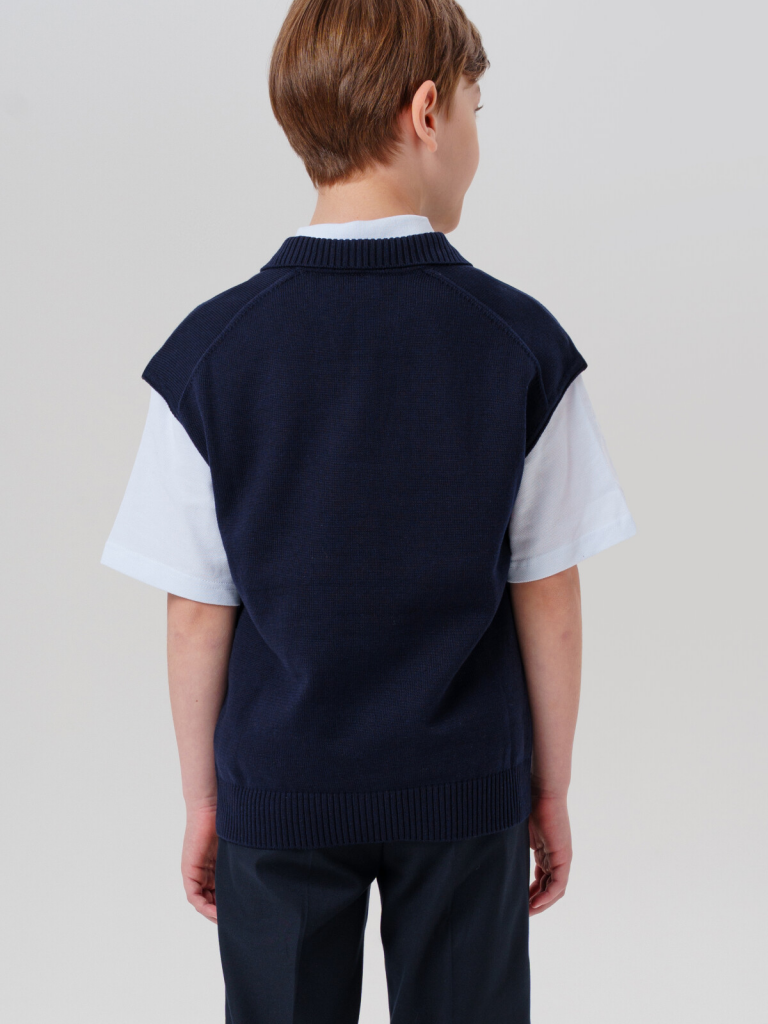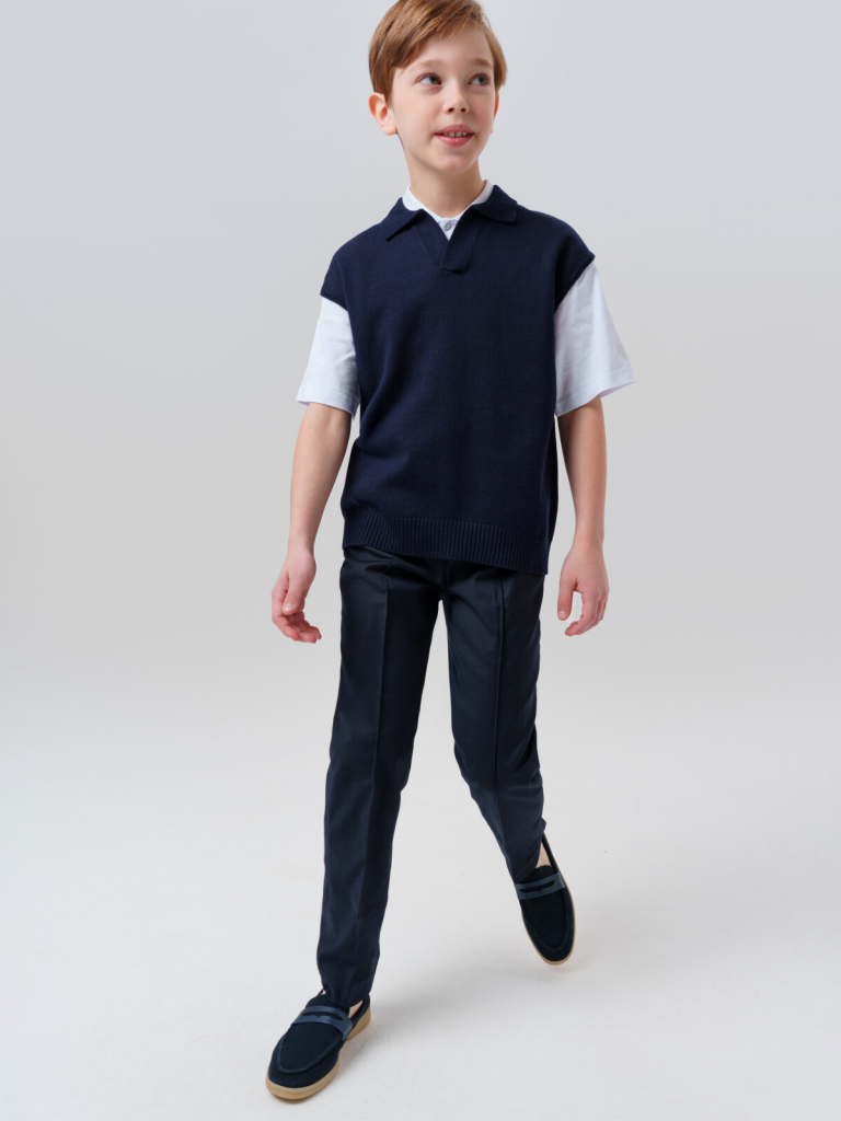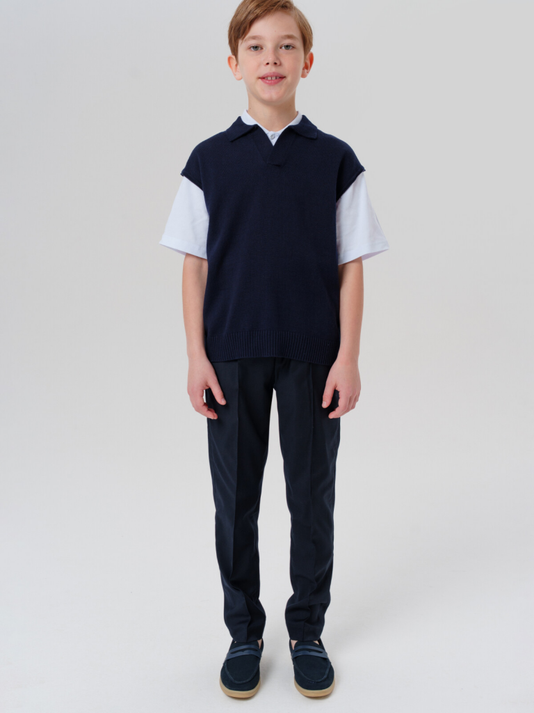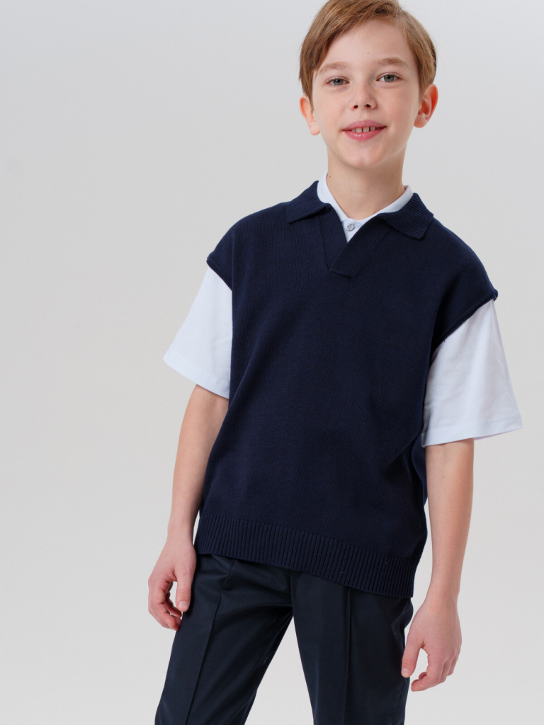 Стильный школьный темно-синий жилет для мальчика-подростка.Этот модный жилет для школы станет универсальным элементом гардероба юного стиляги. Модель выполнена в comfort силуэте - свободный крой обеспечивает комфорт в движении и современный внешний вид.Почему стоит выбрать:Идеально подходит для школы - сочетает удобство и аккуратный внешний видУдобный крой не сковывает движенияСтильный дизайн понравится подросткам, следящим за модойОтличный вариант для повседневной носки и школьных будней. Качественные материалы и продуманный крой делают этот жилет практичным выбором для мальчика-школьника.