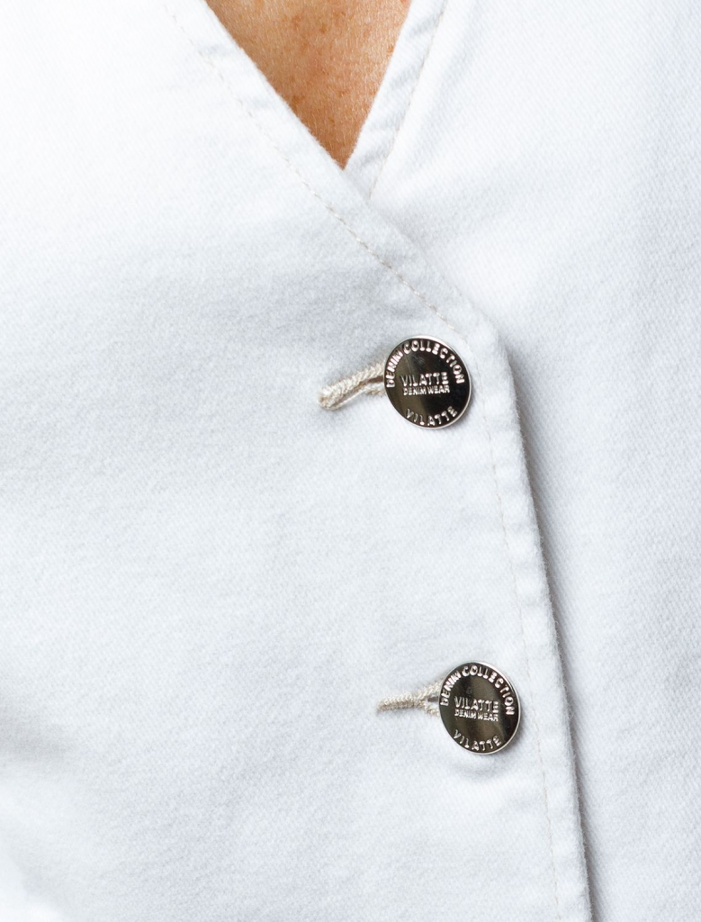 Жилет выполнен из эластичного денима. Крой, приталенный с V-образным вырезом подчеркнут тонкими бежевыми строчками. Изделие хорошо сочетается в total denim образе или низами из лиоцелла, льна и хлопка. Эластичный материал гарантирует комфорт и формоустойчивость.