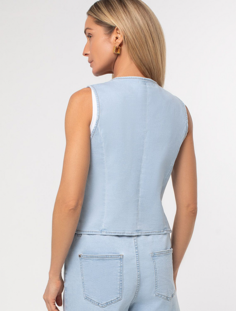 Жилет выполнен из эластичного денима. Крой, приталенный с V-образным вырезом подчеркнут тонкими бежевыми строчками. Изделие хорошо сочетается в total denim образе или низами из лиоцелла, льна и хлопка. Эластичный материал гарантирует комфорт и формоустойчивость.